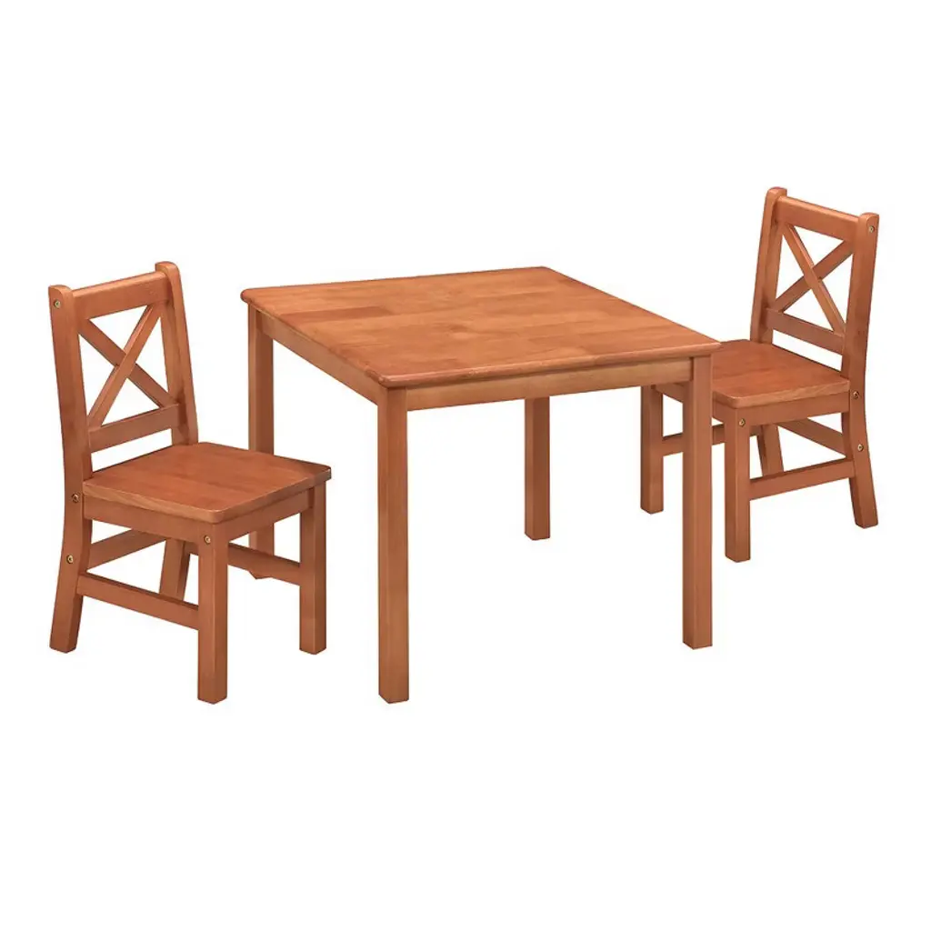 This Kids Table and Chair Set is made of eco-friendly solid hard wood and comes in an natural finish. It is perfect for your kids for learning and entertainment activities, such as reading, painting, game play and so on. Recommended for kids 5 – 7, but the seats are designed to hold up to 100lbs for when older siblings and parents are invited to tea time. Our chairs tuck in underneath the table to save space. Our table set features smoothed edges and surfaces for style and added safety. This piece compliments a wide variety of nursery and playroom themes while adding a modern element to the home. Assembly is quick and easy with our provided hardware packs.