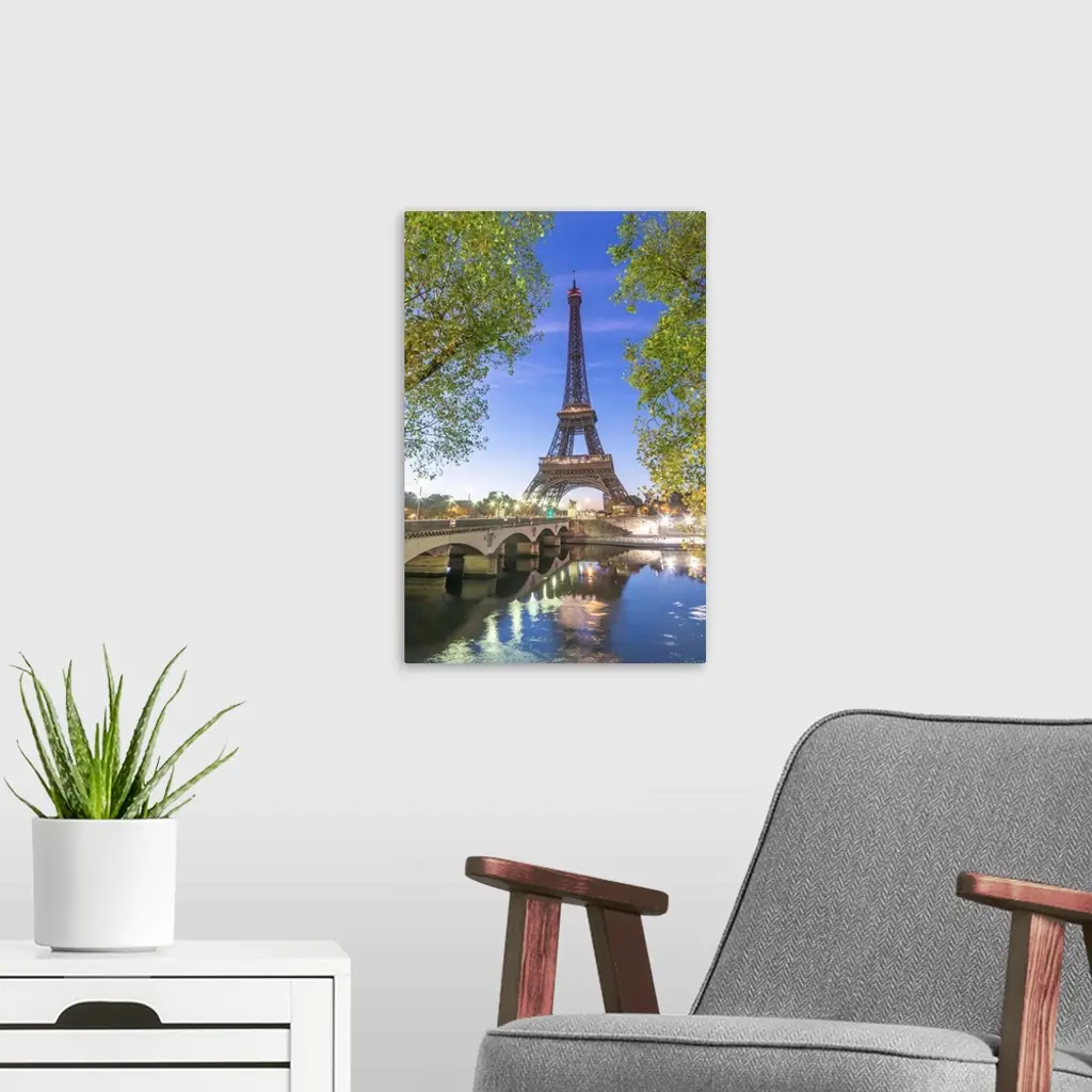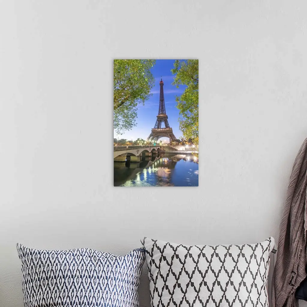 Early morning for the Eiffel tower in Paris, facing the Jena bridge with green trees around and lights.