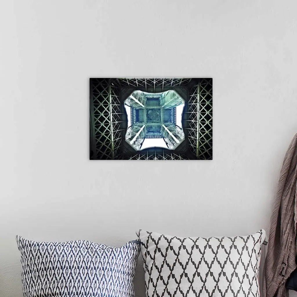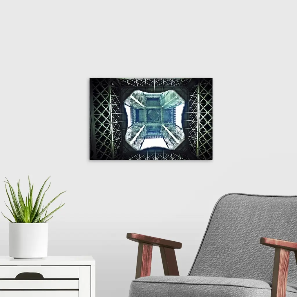 Horizontal photograph on a large canvas looking upward through the center of the Eiffel Tower in Paris.