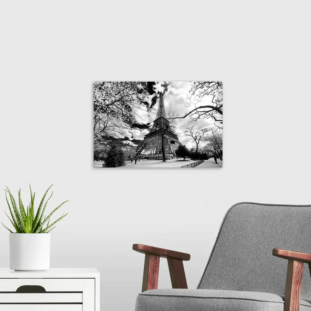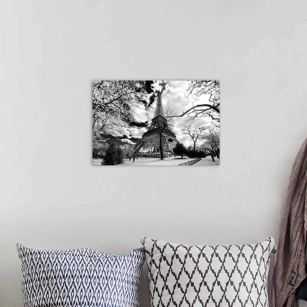View of the iconic Eiffel Tower from the ground under stunning clouds.