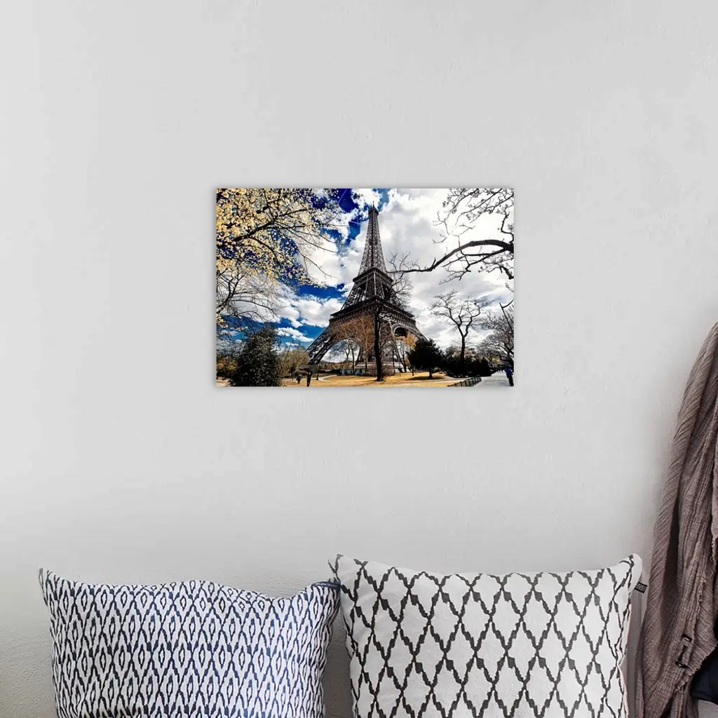 View of the iconic Eiffel Tower from the ground under stunning clouds.