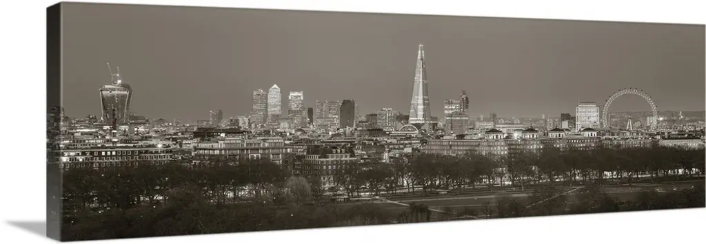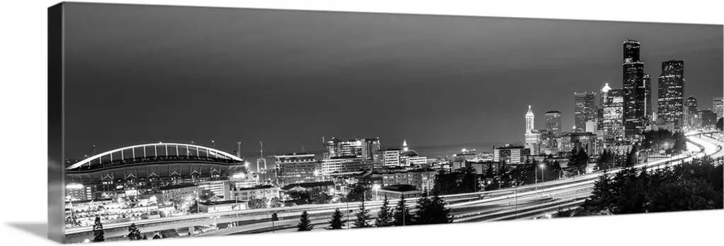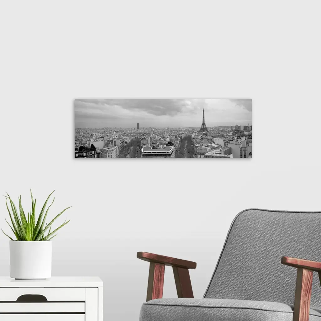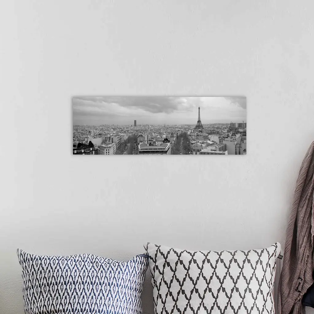 An aerial, monochromatic photograph of the city skyline and two large tree lined avenues below in this panoramic wall art.