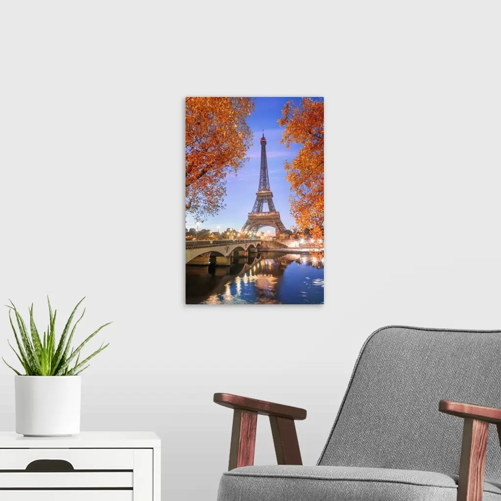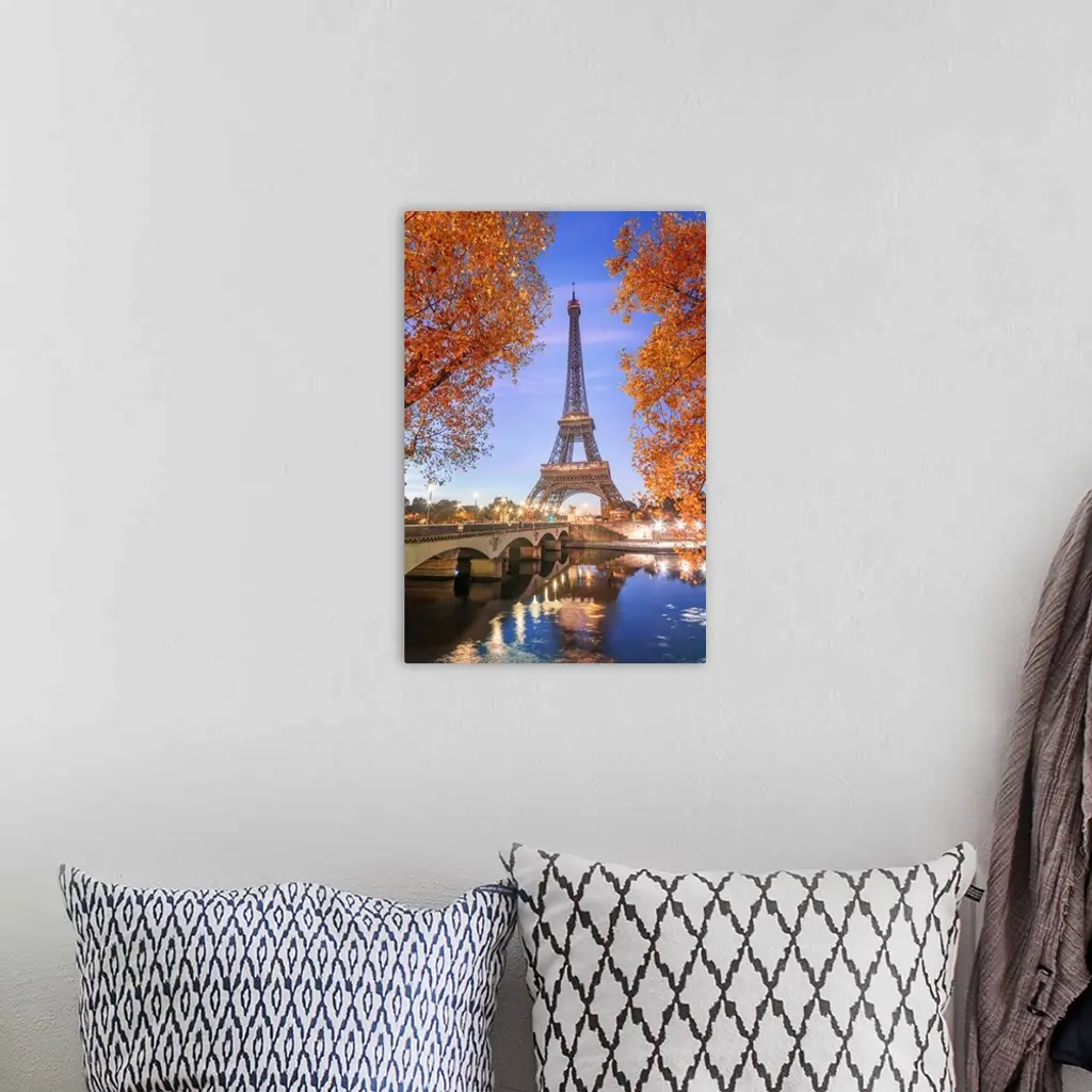Early morning for the Eiffel tower in Paris, facing the Jena bridge with green trees around and lights.