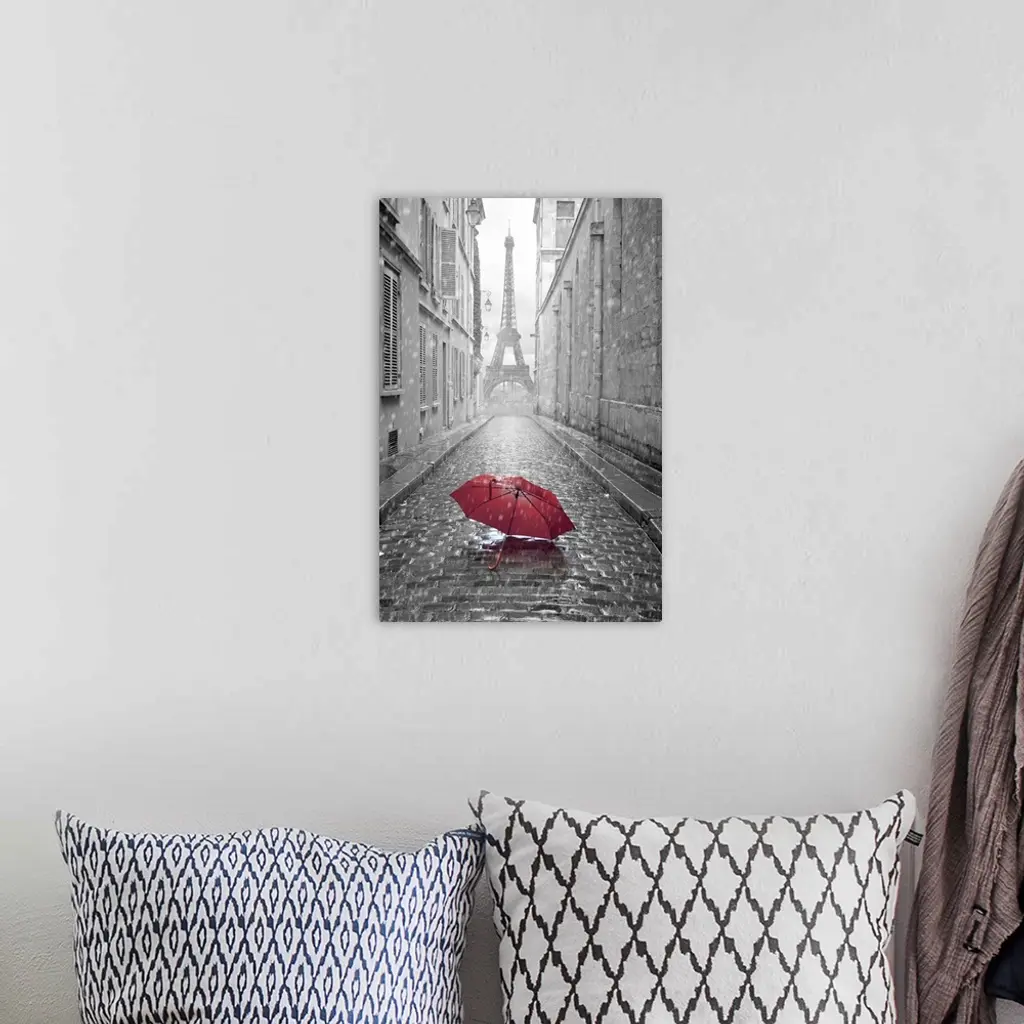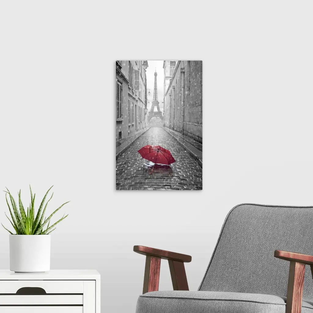 Eiffel tower view from the street of pairs. Black and white photo with red element.