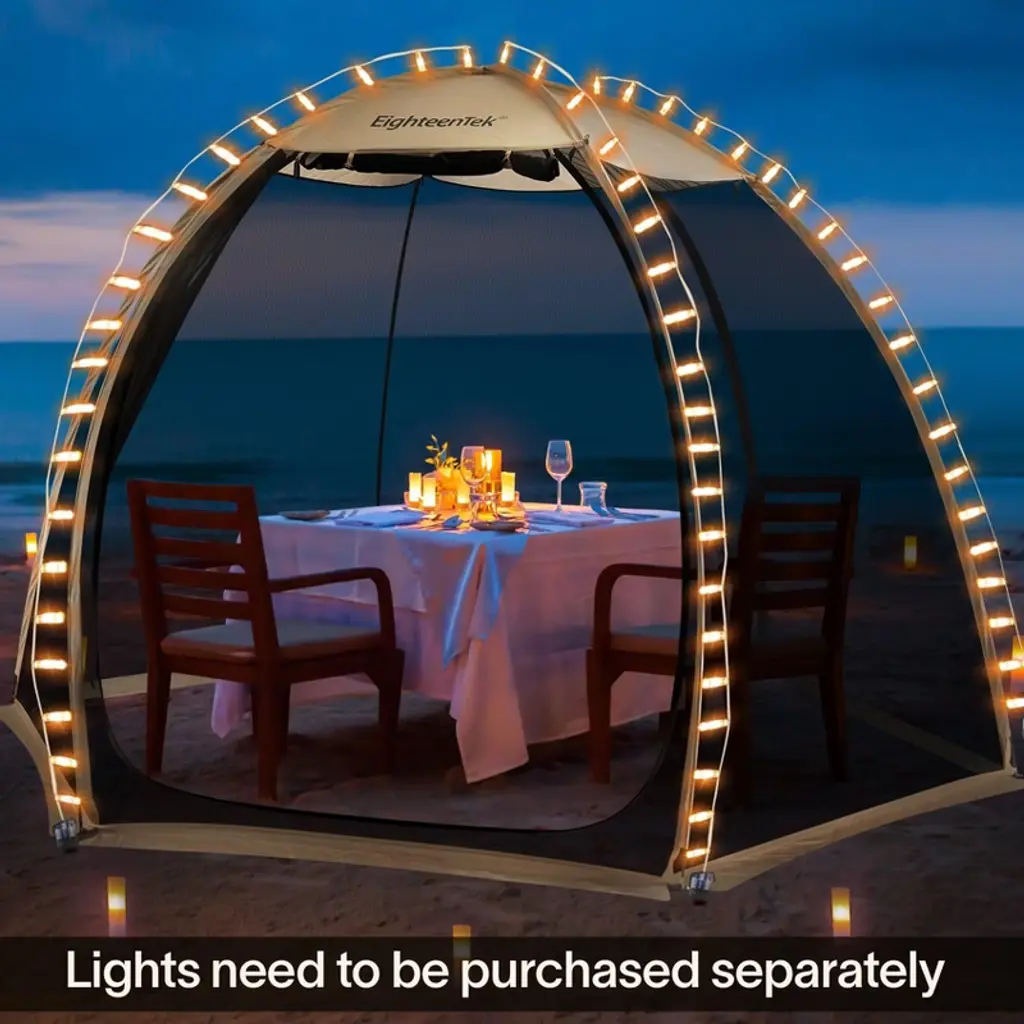 Introducing the EighteenTek Screen House Room Pop Up Gazebo! This beige canopy tent is designed for outdoor camping and activities, providing a convenient sun shade shelter with mesh walls.