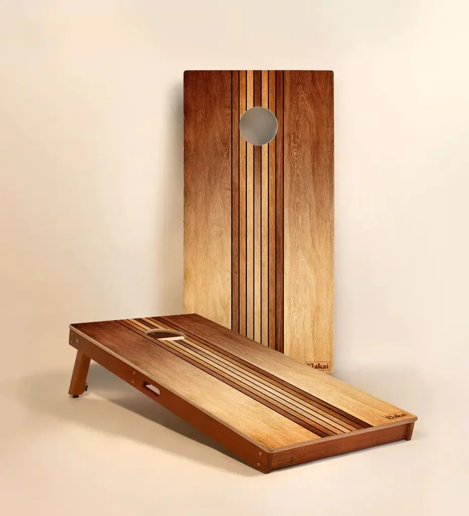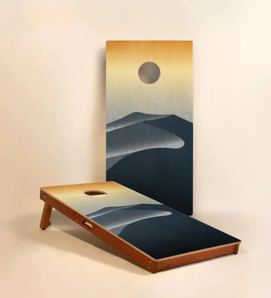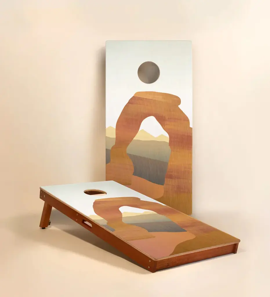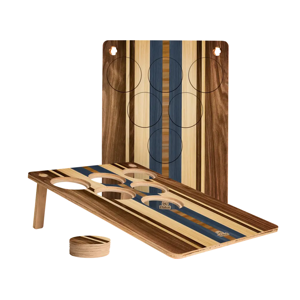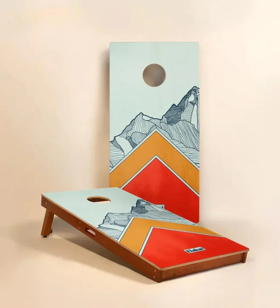 This lightweight portable travel cornhole pong game allows you to partner up for a new way to throw bags. Although this isn't your tournament cornhole board, it is made from premium plywood and built to hit the road. Outdoor-inspired graphics are printed directly to the wood surface.Proud partners of the National Forest Foundation and 1% for the Planet, Elakai is dedicated to protecting the environment as well as investing in social experiences. Their games are handmade from carefully-selected premium materials. Processed in small batches to the highest standards, each piece is unique and durable. Enjoy the outdoors with Elakai.Note: When not in use, this product needs to be stored indoors.
