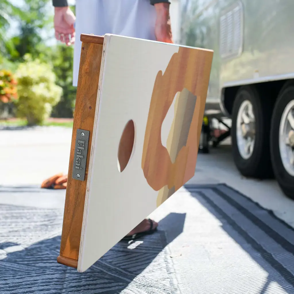 Carefully crafted from the finest materials, this two-by-four-foot regulation cornhole board set features a premium grade plywood deck with a beautiful mahogany frame. Outdoor-inspired graphics are printed directly to the wood surface.Proud partners of the National Forest Foundation and 1% for the Planet, Elakai is dedicated to protecting the environment as well as investing in social experiences. Their games are handmade from carefully-selected premium materials. Processed in small batches to the highest standards, each piece is unique and durable. Enjoy the outdoors with Elakai.Note: When not in use, this product needs to be stored indoors.