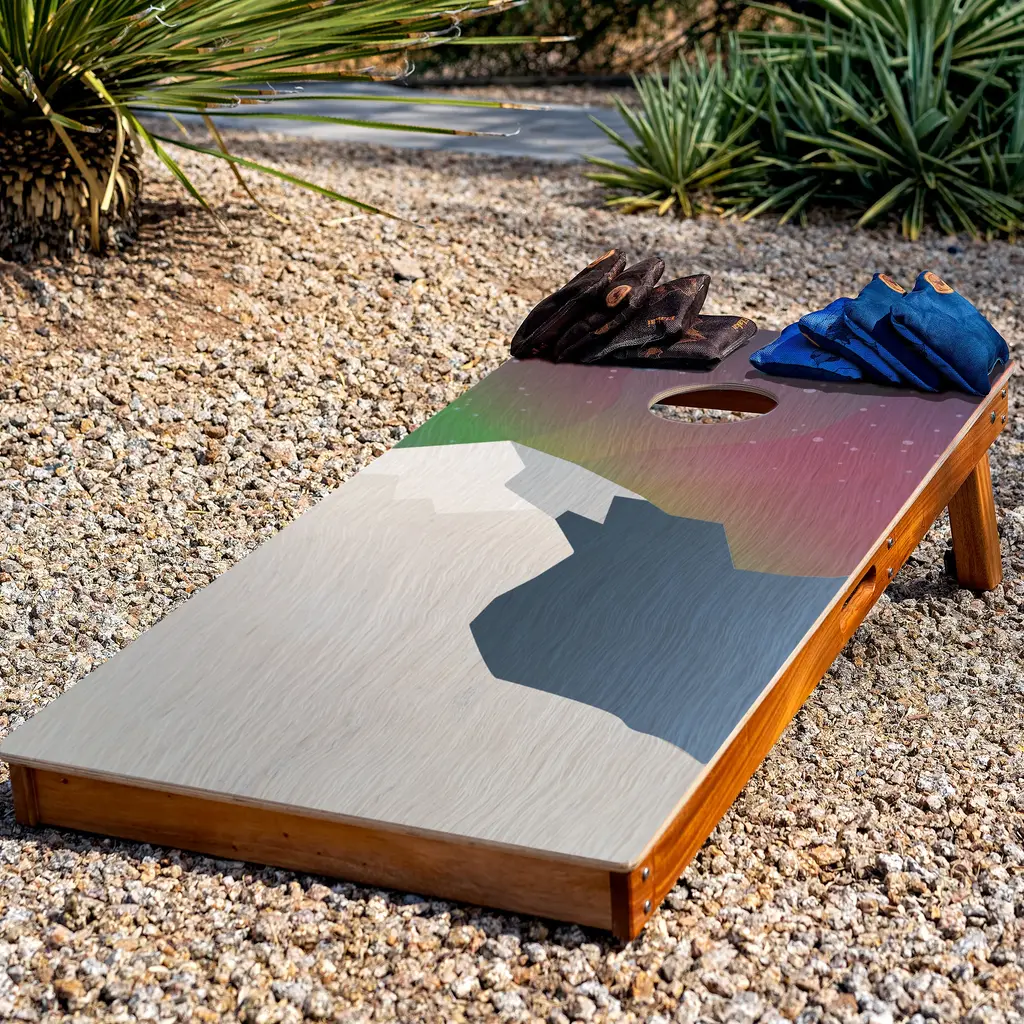 Carefully crafted from the finest materials, this two-by-four-foot regulation cornhole board set features a premium grade plywood deck with a beautiful mahogany frame. Outdoor-inspired graphics are printed directly to the wood surface.Proud partners of the National Forest Foundation and 1% for the Planet, Elakai is dedicated to protecting the environment as well as investing in social experiences. Their games are handmade from carefully-selected premium materials. Processed in small batches to the highest standards, each piece is unique and durable. Enjoy the outdoors with Elakai.Note: When not in use, this product needs to be stored indoors.