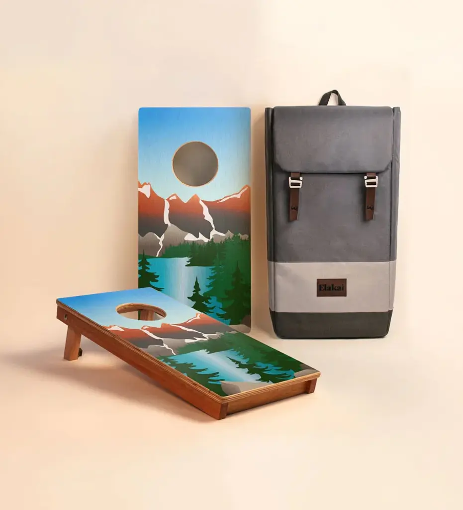 Carefully crafted from the finest materials, this one-by-two-foot regulation cornhole board set features a premium grade plywood deck with a beautiful mahogany frame. Outdoor-inspired graphics are printed directly to the wood surface. Proud partners of the National Forest Foundation and 1% for the Planet, Elakai is dedicated to protecting the environment as well as investing in social experiences. Their games are handmade from carefully-selected premium materials. Processed in small batches to the highest standards, each piece is unique and durable. Enjoy the outdoors with Elakai. Note: When not in use, this product needs to be stored indoors.
