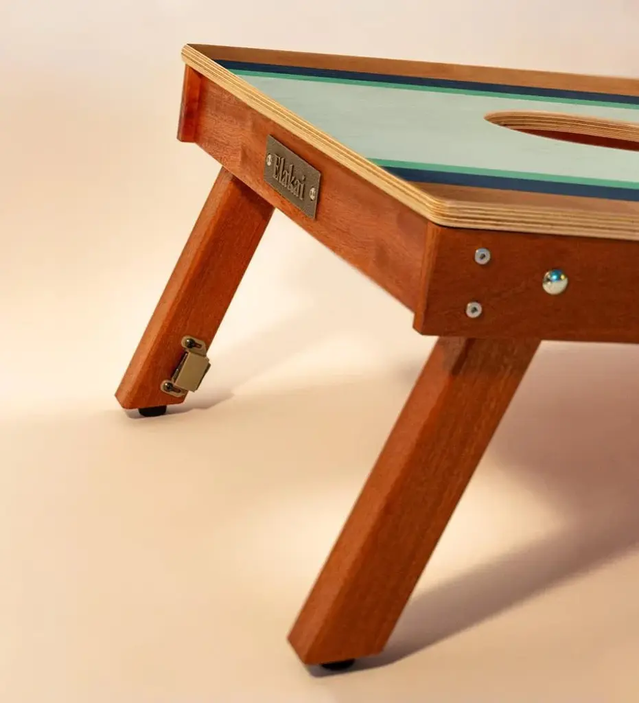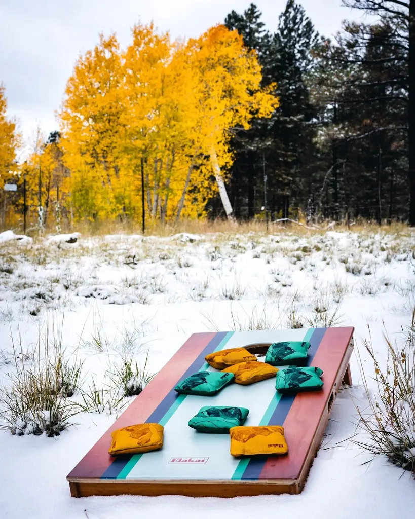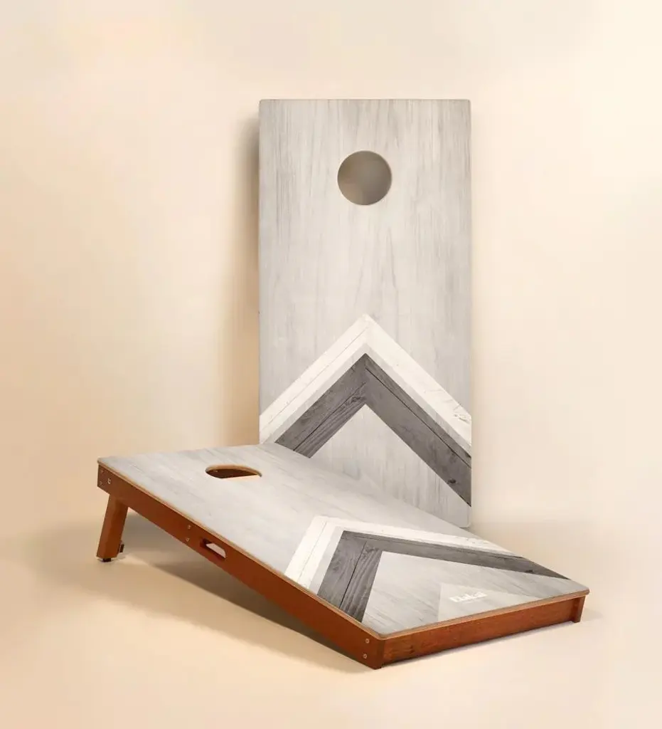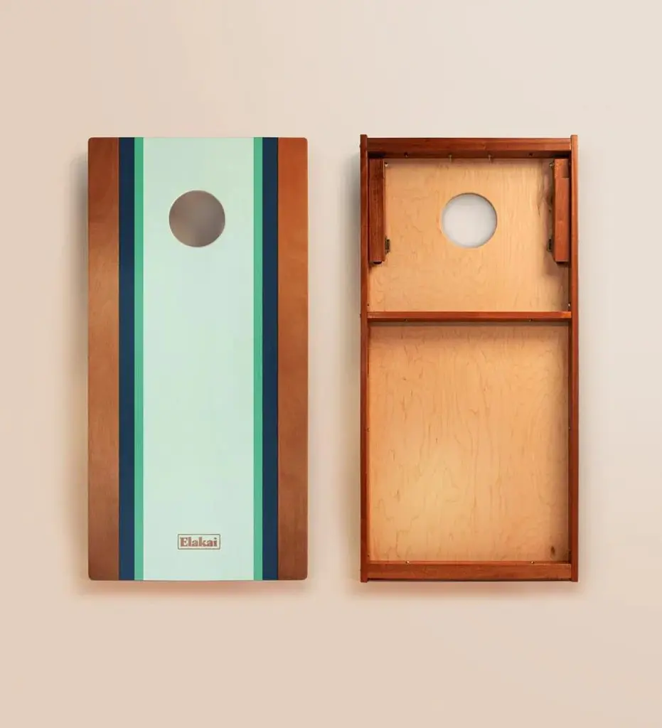 Carefully crafted from the finest materials, this two-by-four-foot regulation cornhole board set features a premium grade plywood deck with a beautiful mahogany frame. Outdoor-inspired graphics are printed directly to the wood surface.Proud partners of the National Forest Foundation and 1% for the Planet, Elakai is dedicated to protecting the environment as well as investing in social experiences. Their games are handmade from carefully-selected premium materials. Processed in small batches to the highest standards, each piece is unique and durable. Enjoy the outdoors with Elakai.Note: When not in use, this product needs to be stored indoors.