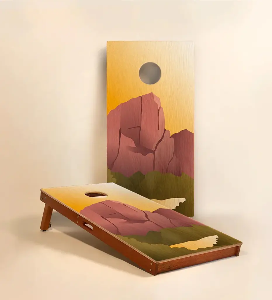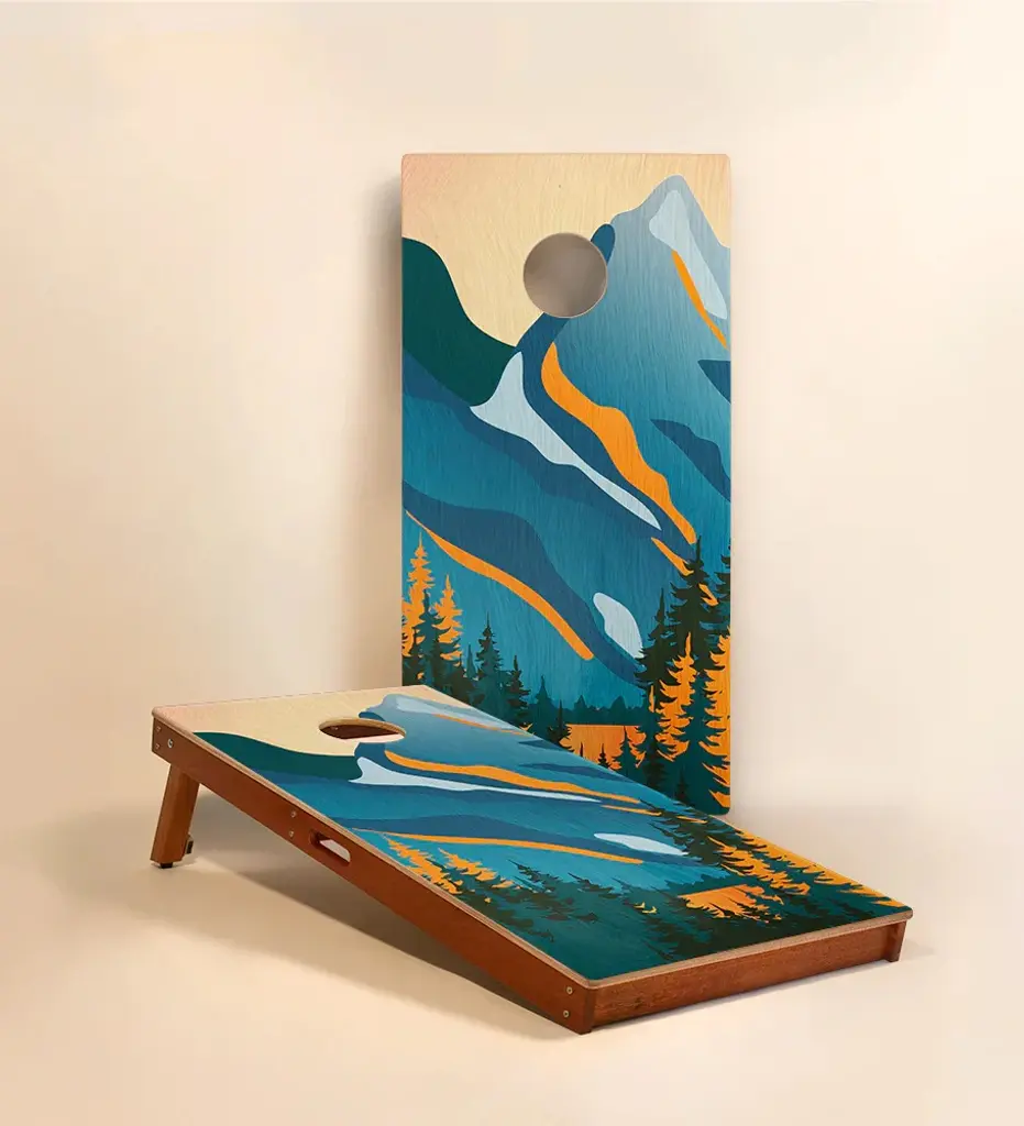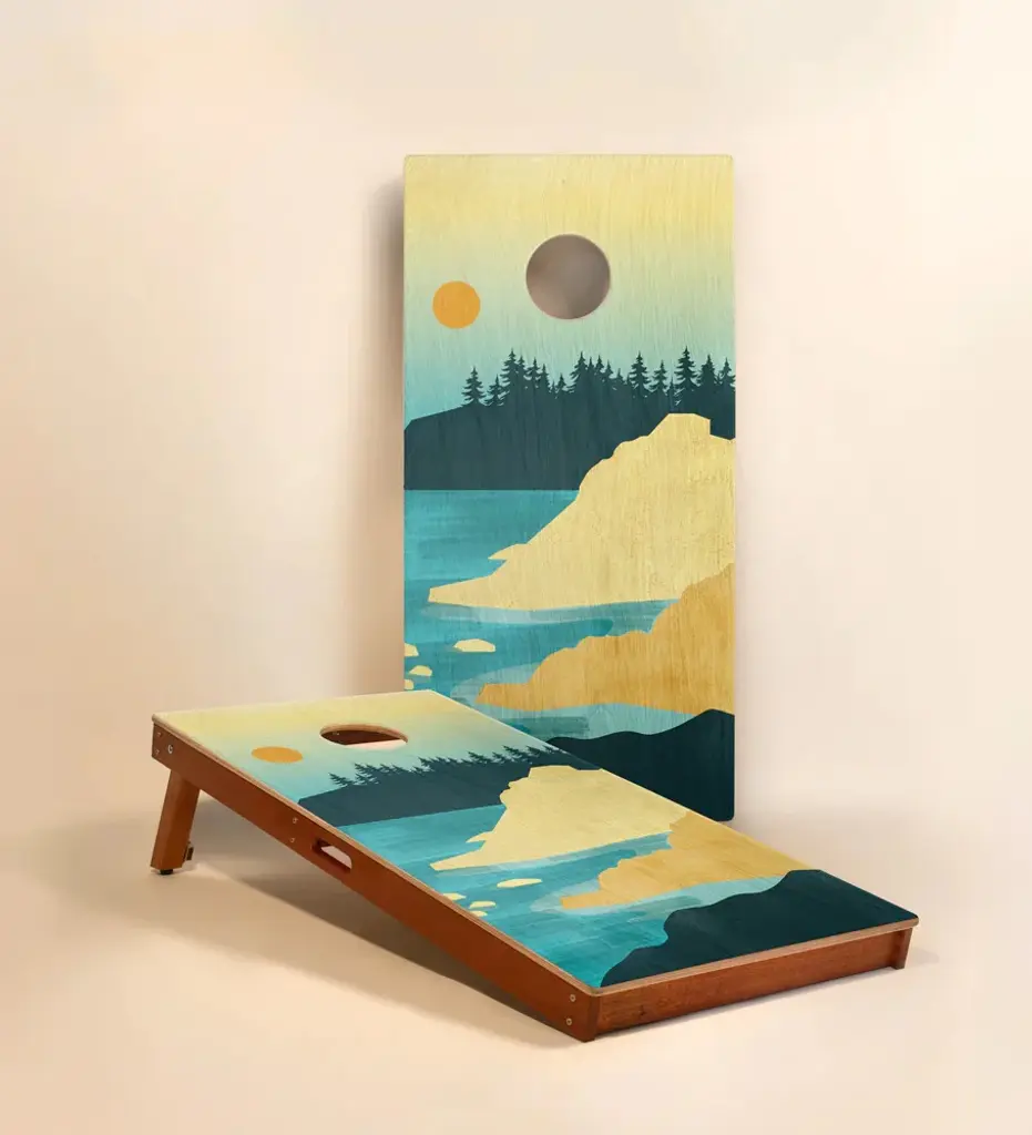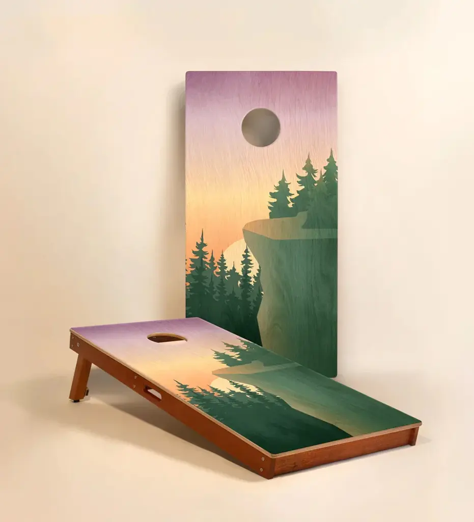Carefully crafted from the finest materials, this two-by-four-foot regulation cornhole board set features a premium grade plywood deck with a beautiful mahogany frame. Outdoor-inspired graphics are printed directly to the wood surface.Proud partners of the National Forest Foundation and 1% for the Planet, Elakai is dedicated to protecting the environment as well as investing in social experiences. Their games are handmade from carefully-selected premium materials. Processed in small batches to the highest standards, each piece is unique and durable. Enjoy the outdoors with Elakai.Note: When not in use, this product needs to be stored indoors.