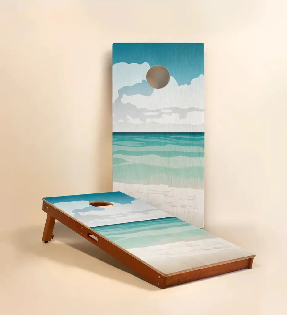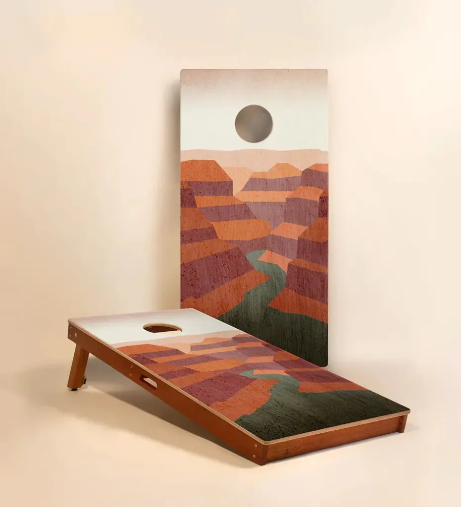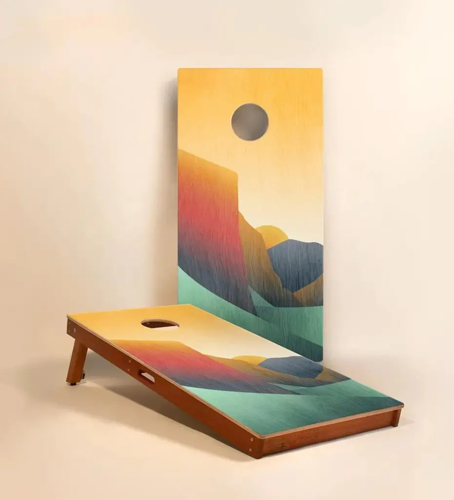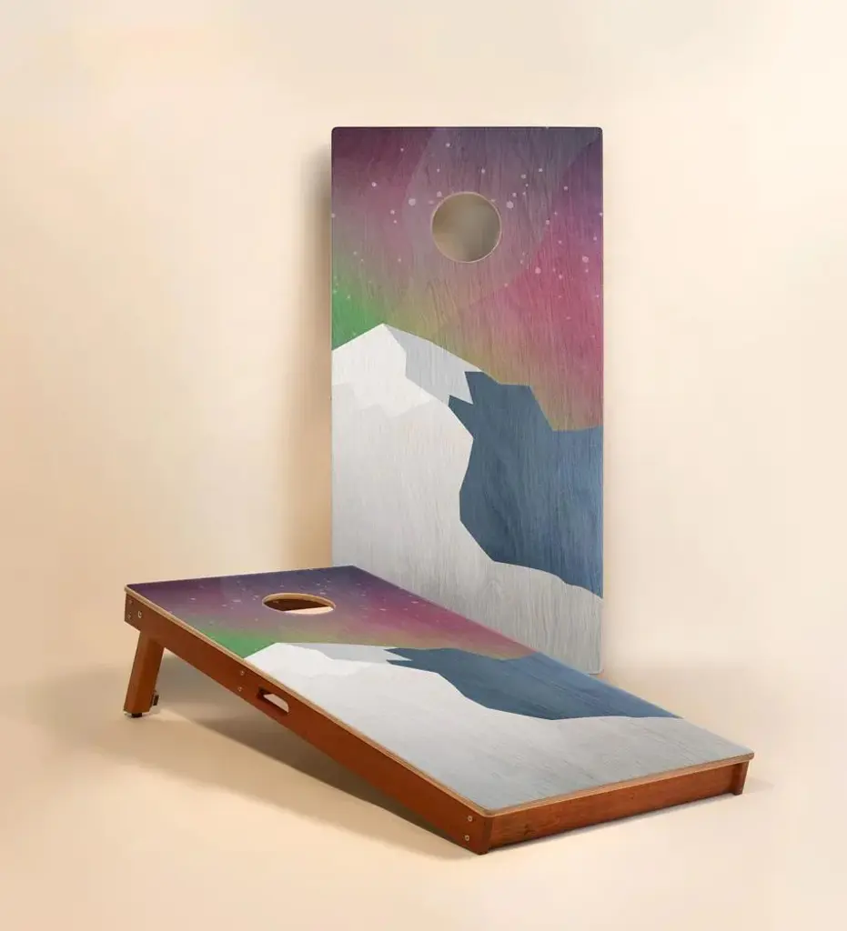 Carefully crafted from the finest materials, this two-by-four-foot regulation cornhole board set features a premium grade plywood deck with a beautiful mahogany frame. Outdoor-inspired graphics are printed directly to the wood surface.Proud partners of the National Forest Foundation and 1% for the Planet, Elakai is dedicated to protecting the environment as well as investing in social experiences. Their games are handmade from carefully-selected premium materials. Processed in small batches to the highest standards, each piece is unique and durable. Enjoy the outdoors with Elakai.Note: When not in use, this product needs to be stored indoors.
