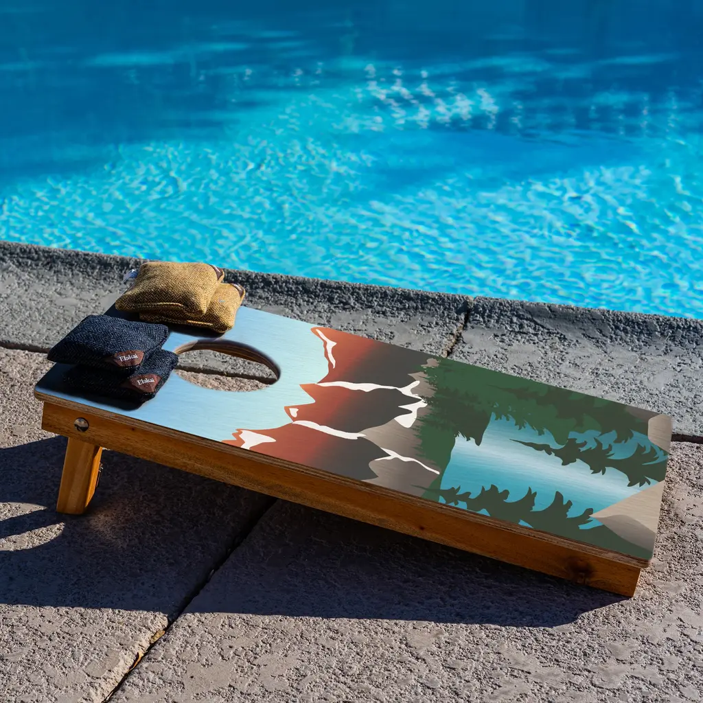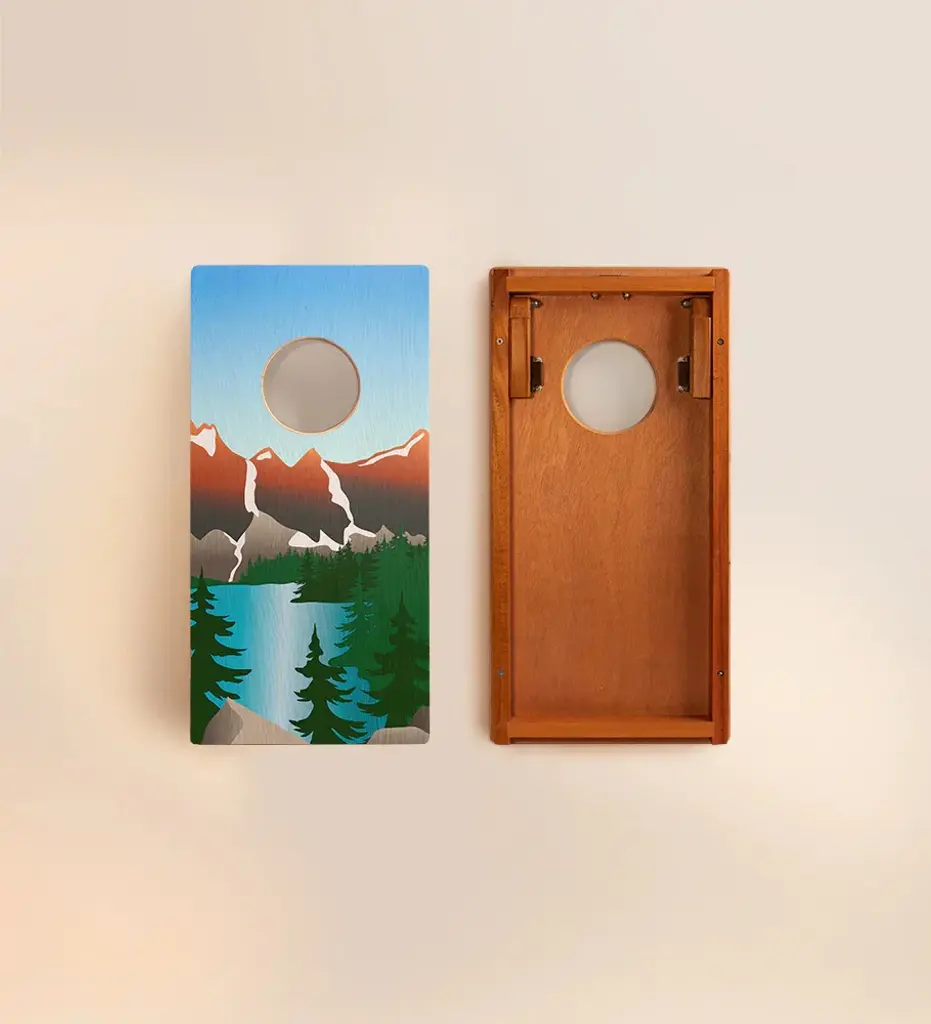 Carefully crafted from the finest materials, this one-by-two-foot regulation cornhole board set features a premium grade plywood deck with a beautiful mahogany frame. Outdoor-inspired graphics are printed directly to the wood surface. Proud partners of the National Forest Foundation and 1% for the Planet, Elakai is dedicated to protecting the environment as well as investing in social experiences. Their games are handmade from carefully-selected premium materials. Processed in small batches to the highest standards, each piece is unique and durable. Enjoy the outdoors with Elakai. Note: When not in use, this product needs to be stored indoors.