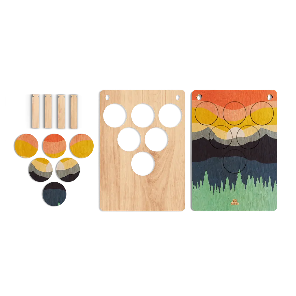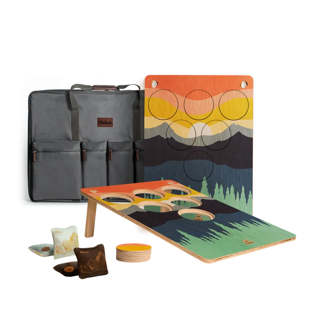 This lightweight portable travel cornhole pong game allows you to partner up for a new way to throw bags. Although this isn't your tournament cornhole board, it is made from premium plywood and built to hit the road. Outdoor-inspired graphics are printed directly to the wood surface.Proud partners of the National Forest Foundation and 1% for the Planet, Elakai is dedicated to protecting the environment as well as investing in social experiences. Their games are handmade from carefully-selected premium materials. Processed in small batches to the highest standards, each piece is unique and durable. Enjoy the outdoors with Elakai.Note: When not in use, this product needs to be stored indoors.