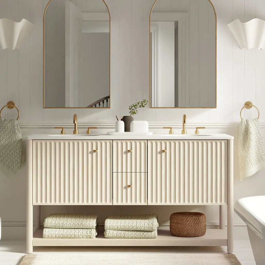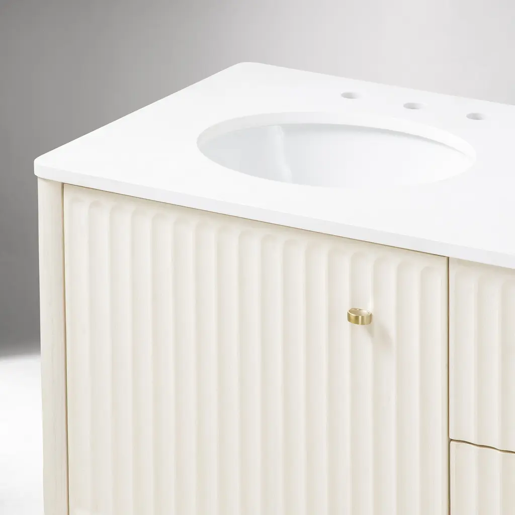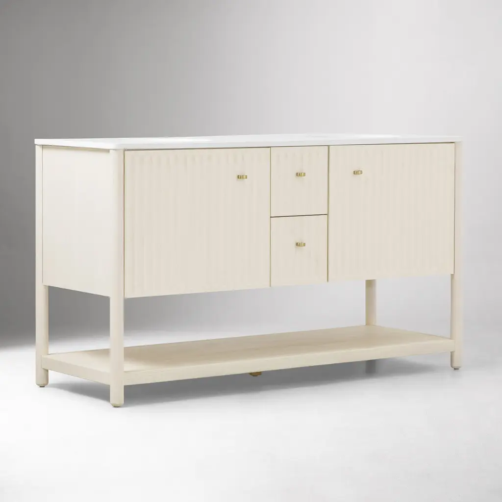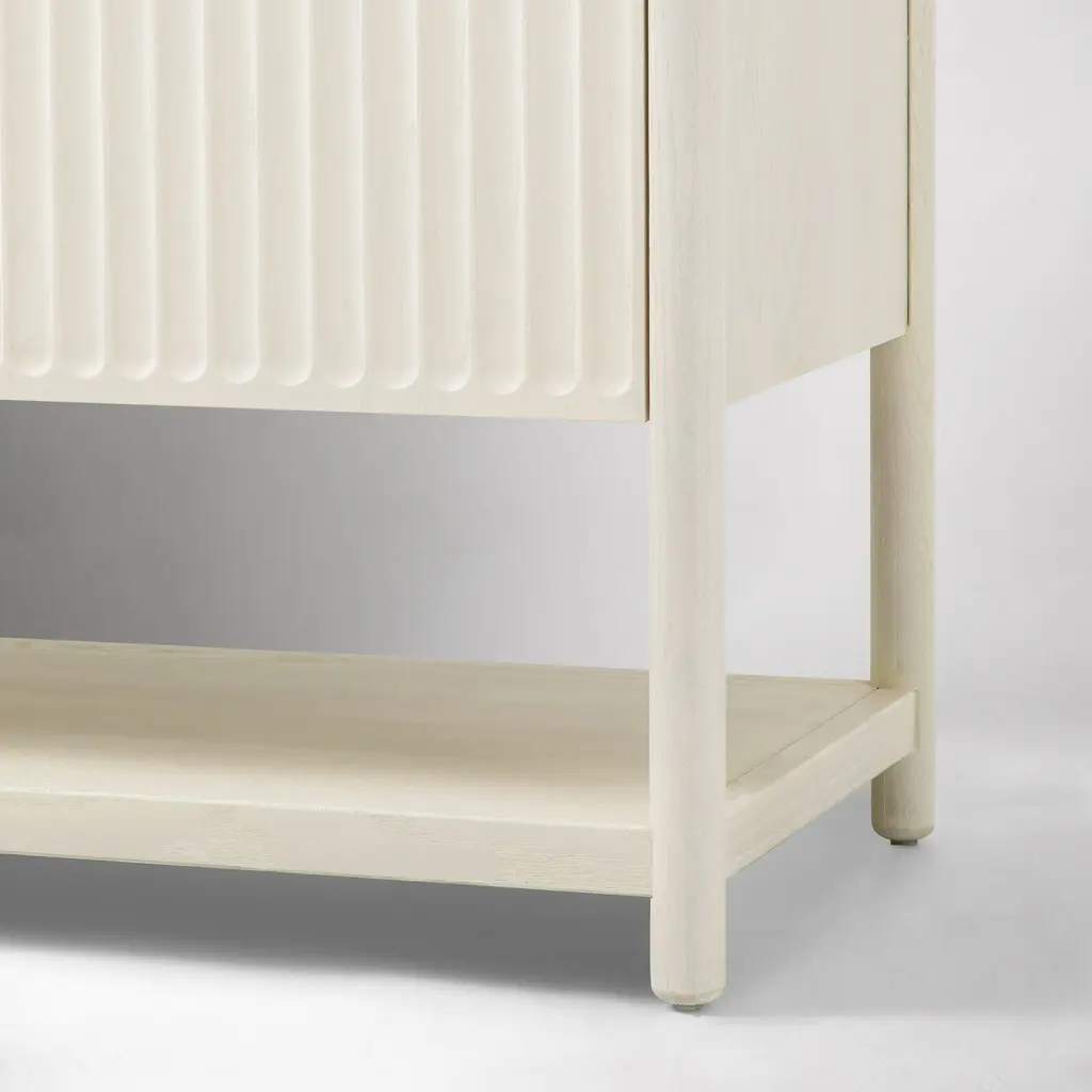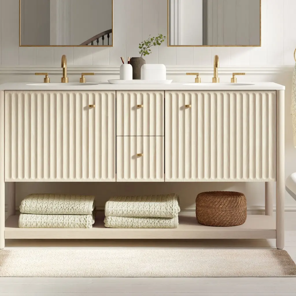 Inverted fluting detail adds a gentle, textured touch. Ample room to store bathroom essentials, linens and more. The ultimate vanity for your get-ready routine. Made with FSC®-certified wood.