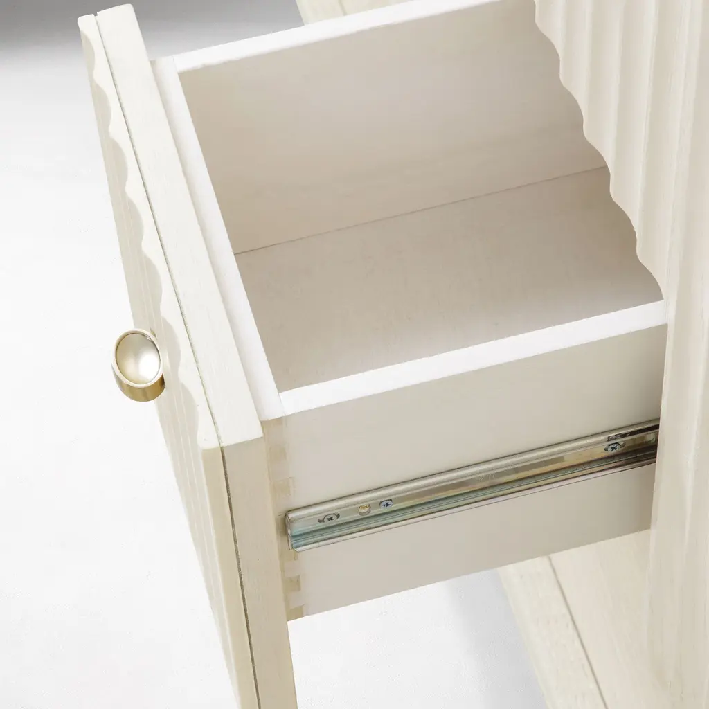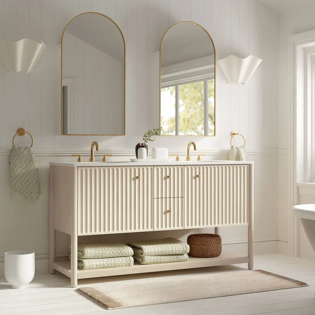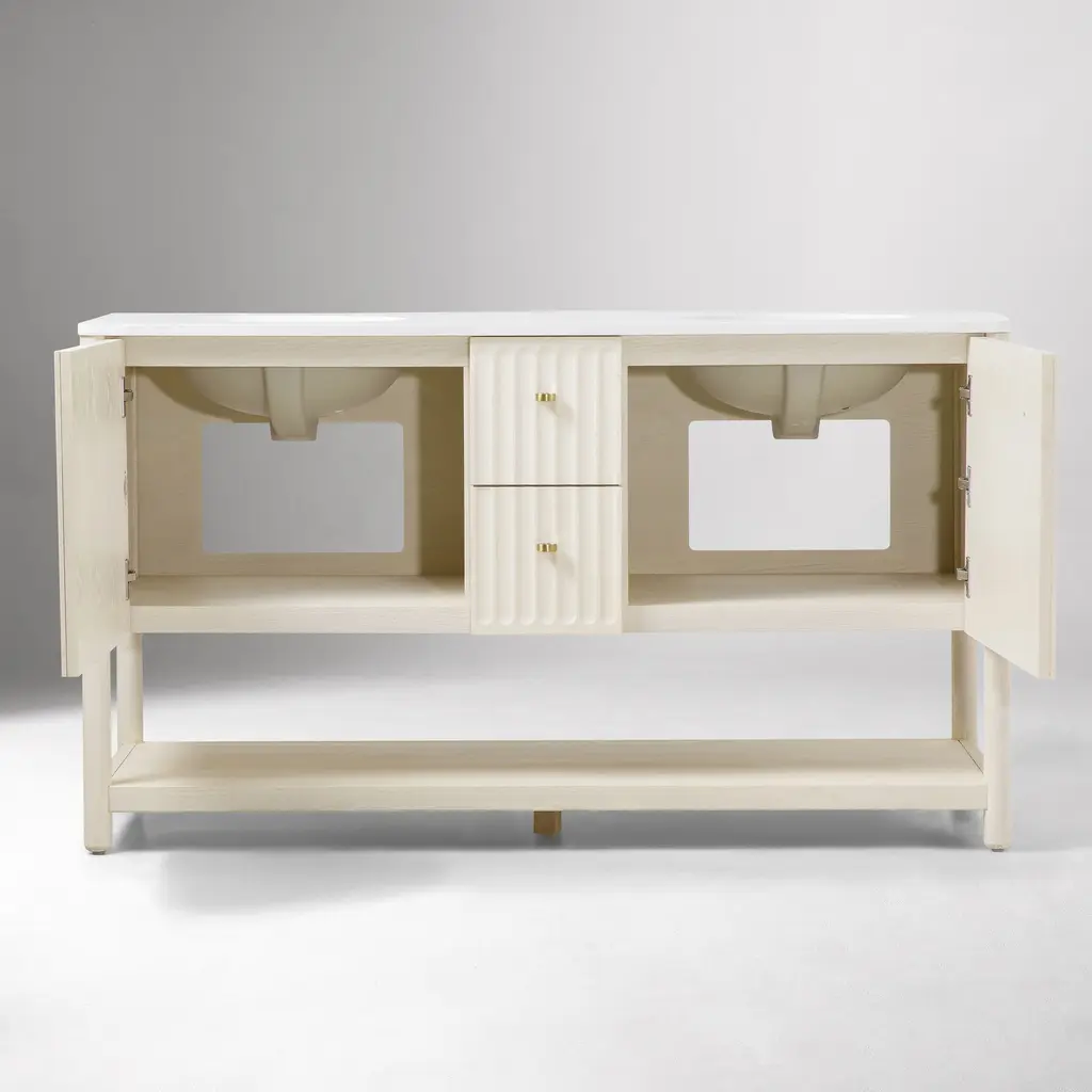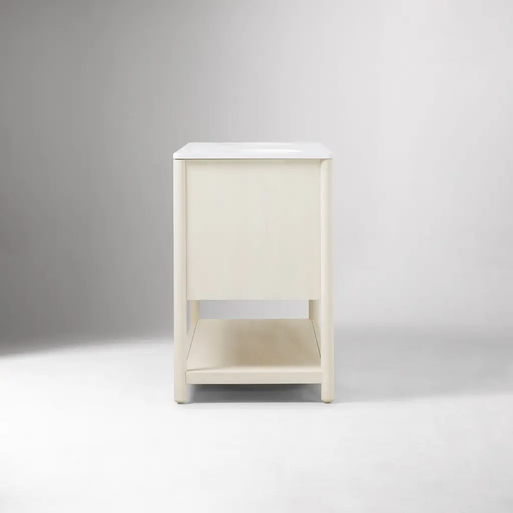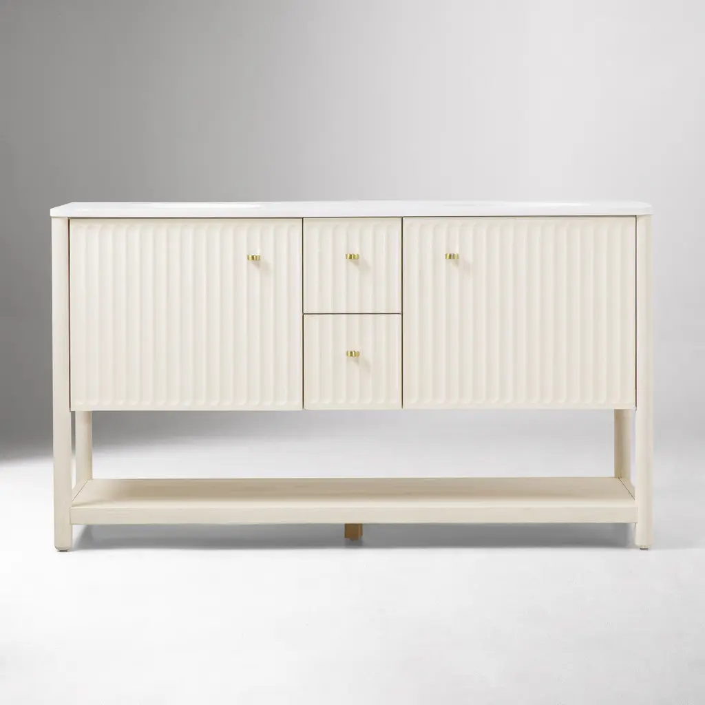Inverted fluting detail adds a gentle, textured touch. Ample room to store bathroom essentials, linens and more. The ultimate vanity for your get-ready routine. Made with FSC®-certified wood.