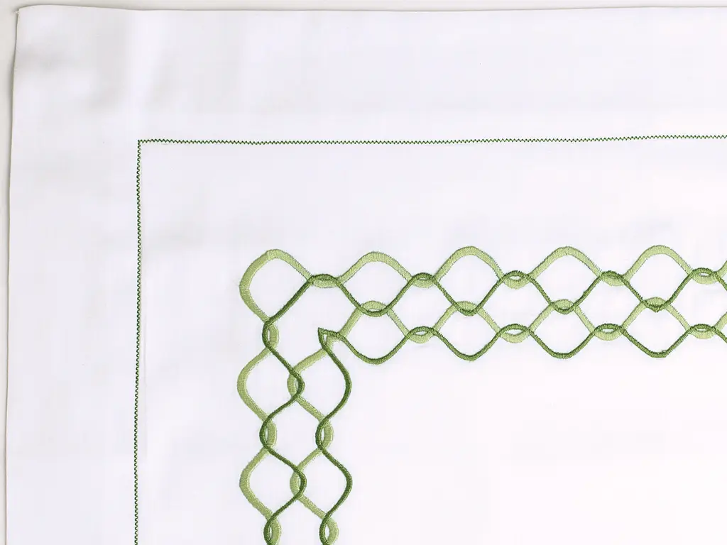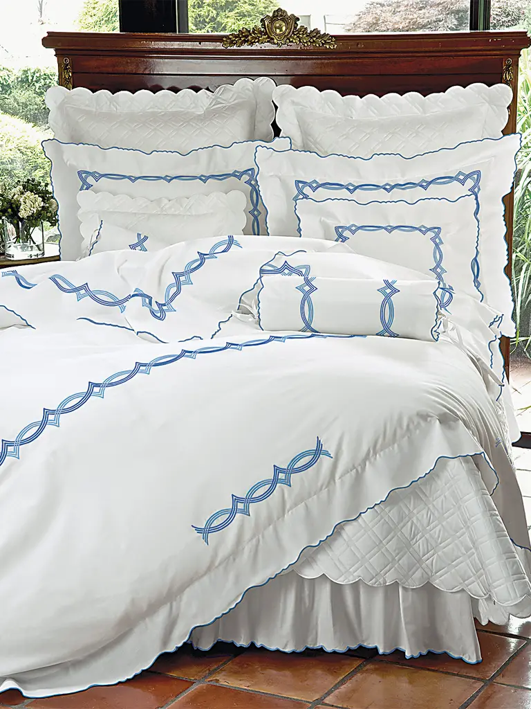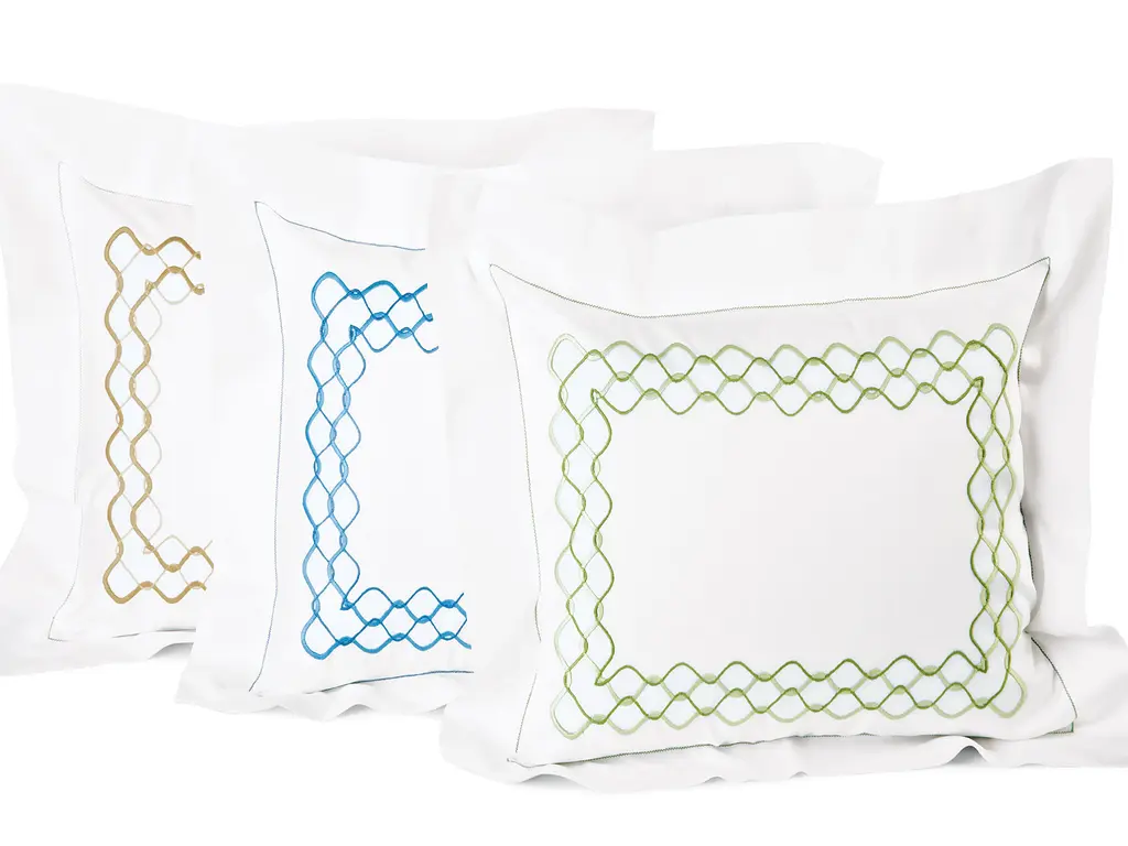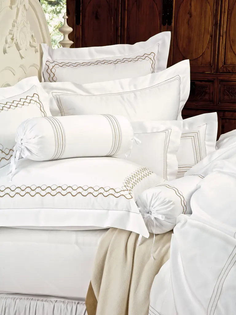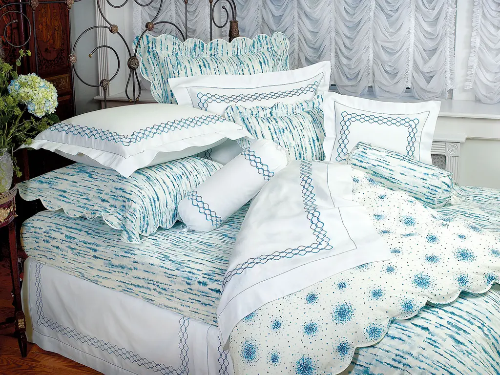 A superb example of embroidery's power to transform utter simplicity into vibrant beauty is this electrifying wave motif. Impeccably rendered in two tones of Beige, Blue or Green on sumptuous White 100% Egyptian cotton sateen, 300 thread count. Extraordinary Italian tailoring adds refined flanges with mitered corners and tiny zig-zag stitching, and button enclosures on the shams and duvet covers.