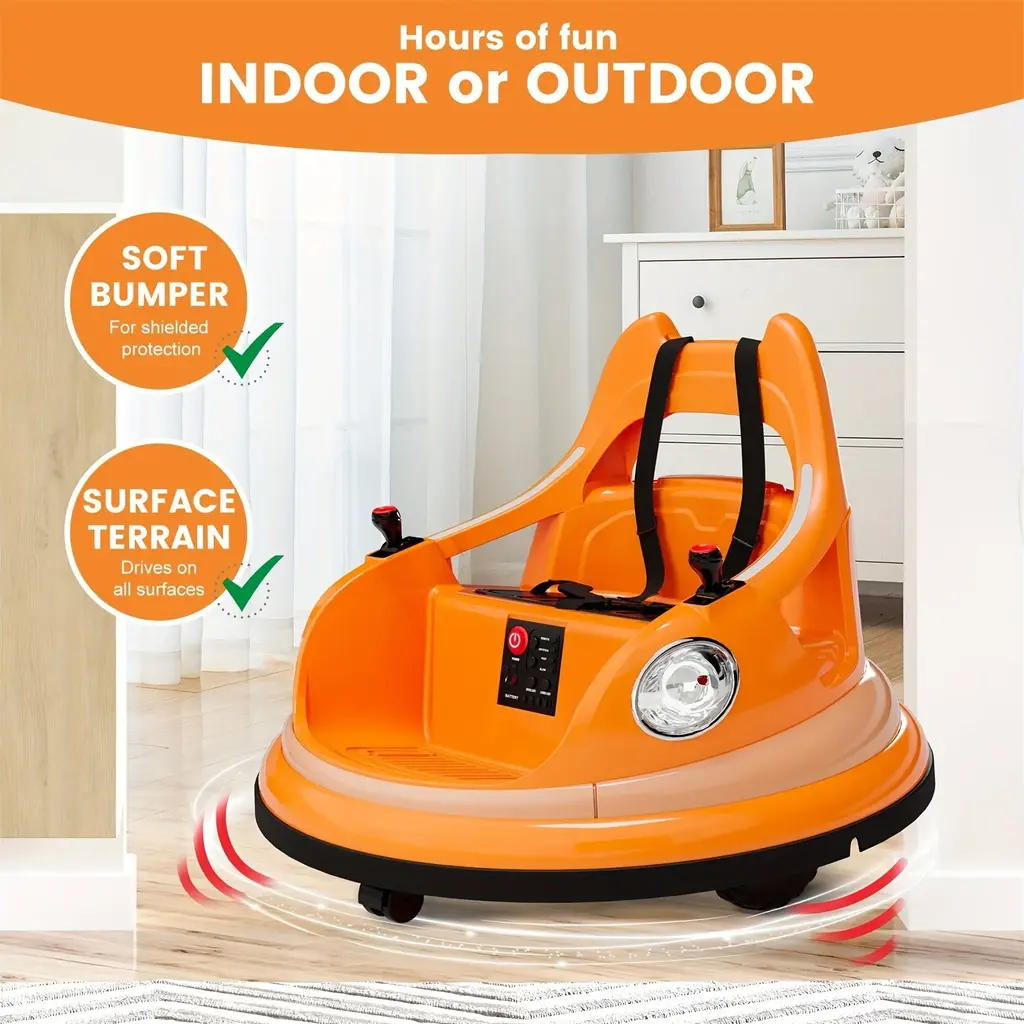 60-Degree Rotation: This bumper car features a 360-degree spin for added smiles and greater riding fun. It is ideal for boys and girls aged 4-8 years, with a maximum weight capacity of 66 lbsManual and Remote Operation: Allow your boys and girls to drive manually or use the 2.4GHz remote control to guide them when needed; the remote includes forward/reverse and turn controlsLights & Sounds: A set of functional lights conveniently located on a seat-mounted control panel adds an extra, realistic touch to playtime!Premium Performance: Equipped with a rechargeable 12V battery, this ride-on toy provides 1-3 hours of riding enjoyment. The battery charging time is approximately 5 hours, extending to 12 hours for the first chargeTimeless Design: The smooth, curved profile, paired with a thick rubber-like bumper and a fun assortment of vibrant stickers, allows your boys and girls to personalize their ride