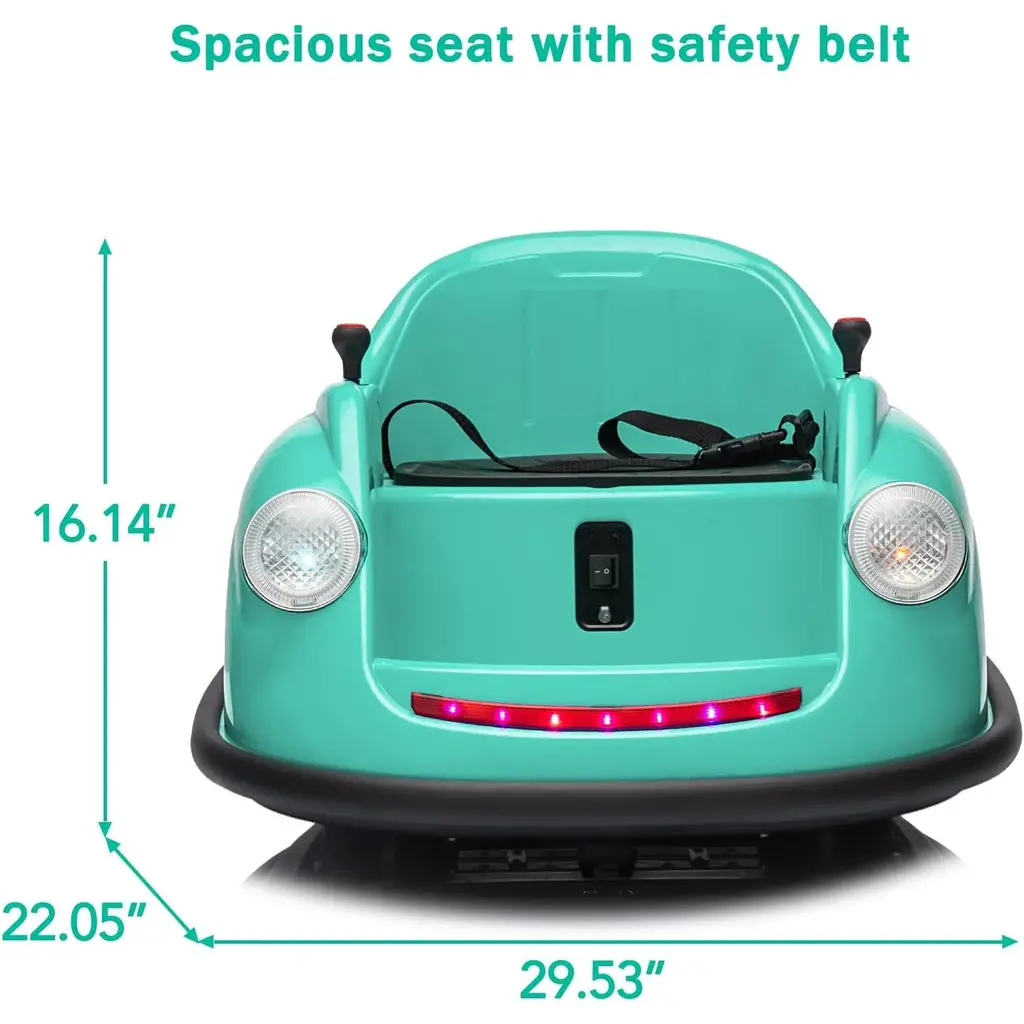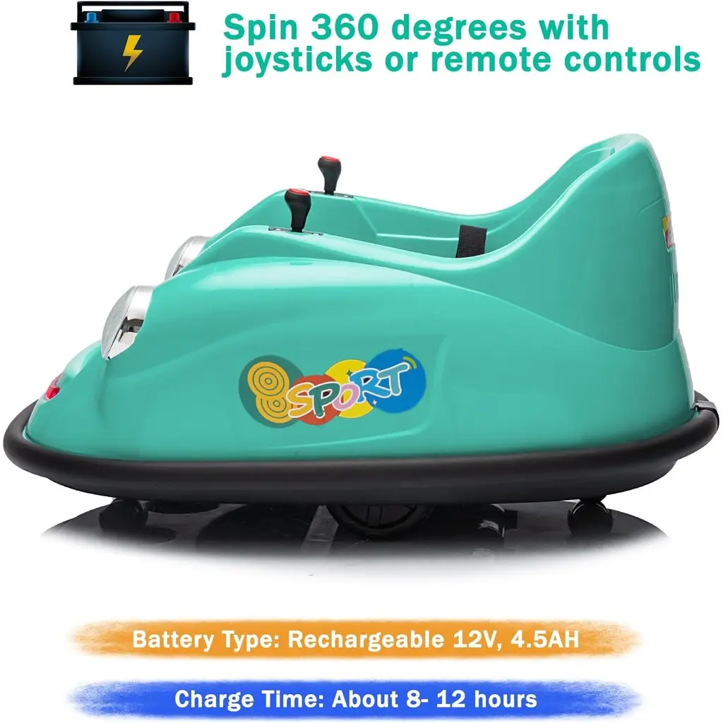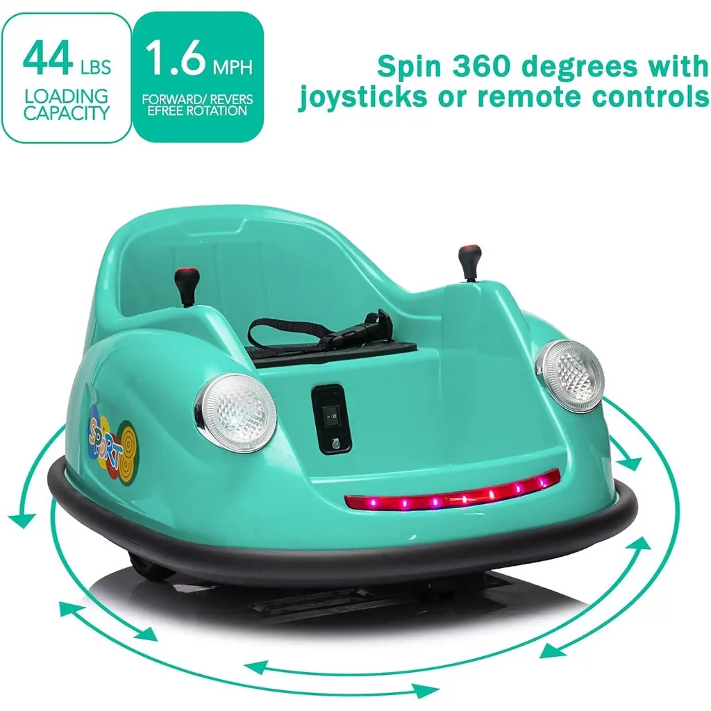 [MANUAL AND REMOTE CONTROL]Your child can enjoy driving their bumper car manually or use the convenient 2.4GHz remote control for guidance when needed. The remote features forward/reverse and steering controls for added safety.[CLASSIC DESIGN]With a sleek, rounded profile and a durable rubber-like bumper, this bumper car is adorned with vibrant stickers that allow your child to customize their ride. It's the perfect gift for birthdays, holidays, or any special occasion, providing endless fun and excitement![360-DEGREE SPIN]Experience maximum joy with the bumper car's 360-degree spinning capability, ensuring lots of smiles and hours of entertainment. Suitable for toddlers and kids aged 1.5 to 6 years, with a weight limit of 66 lbs.[LIGHTS & SOUNDS]Equipped with functional lights on a seat-mounted control panel, this bumper car adds a realistic element to playtime! Ideal for any birthday or special celebration, this gift is sure to delight your child and bring excitement to their everyday adventures.[PREMIUM PERFORMANCE]Featuring a rechargeable 12V battery, kids can enjoy 1-3 hours of riding fun on a full charge. The battery charging time is approximately 5 hours, and the first charge may take around 12 hours for optimal performance.