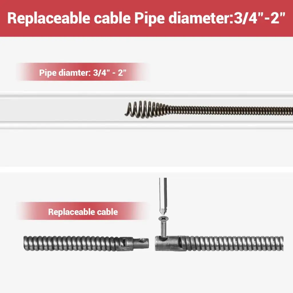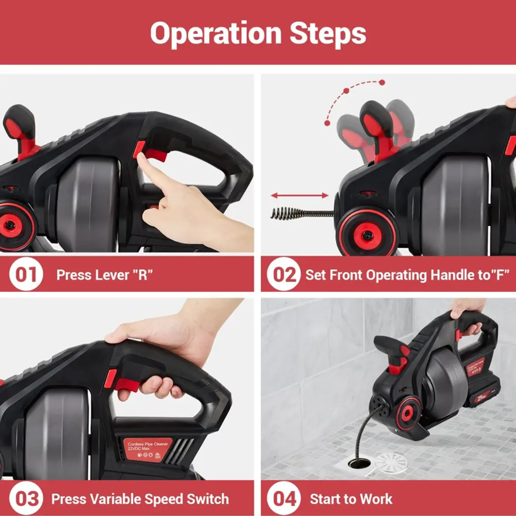 25-Foot Electric Drain Auger with 3-In-1 Clog RemovalHeavy-Duty Cordless Plumbing Snake for Toilets, Sinks & Sewer LinesCore Functionality3-In-1 Gear System:? Forward Rotation: Crushes/entangles clogs (0-560 RPM)? Neutral ("0" Gear): Holds debris for extraction? Reverse Rotation: Retracts obstructionsPipe Compatibility: 3/4" to 2" diameter drainsCable Length: 25-foot flexible steel cable navigates L/U/S-bendsErgonomic DesignRubberized non-slip grip handleIntegrated LED work light for low-visibility areasRear drainage port prevents water accumulation in drumBalanced weight distributionProfessional-Grade FeaturesSingle-handed lever-controlled cable feed/retraction4-inch minimum pipe clearance requirement (prevents cable twisting)Reusable construction for repeated clogsIndoor/outdoor application versatilityKey SpecificationsCable Length: 25 ft (7.6 m)Power Source: Cordless 18V batterySpeed Control: Variable pressure triggerSpecial Functions: Forward/neutral/reverse gears + LED lightOperation Alert: Auto-stop when water tank overfillsThis electric drain auger combines industrial-grade power with user-centric design through its variable-speed motor and 3-in-1 gear system. The 25-foot cable reaches deep blockages in complex pipe configurations, while the cordless battery enables unrestricted movement. The pressure-sensitive trigger allows precise RPM control (0-560) for tackling diverse obstructions ¨C from hair in bathroom sinks to paper clogs in toilets. Critical operational notes include maintaining 4-inch clearance from pipe openings and monitoring water levels in high-humidity environments. The integrated LED light and ergonomic handle ensure comfortable operation in confined spaces, making it equally suitable for professional plumbers and homeowners.