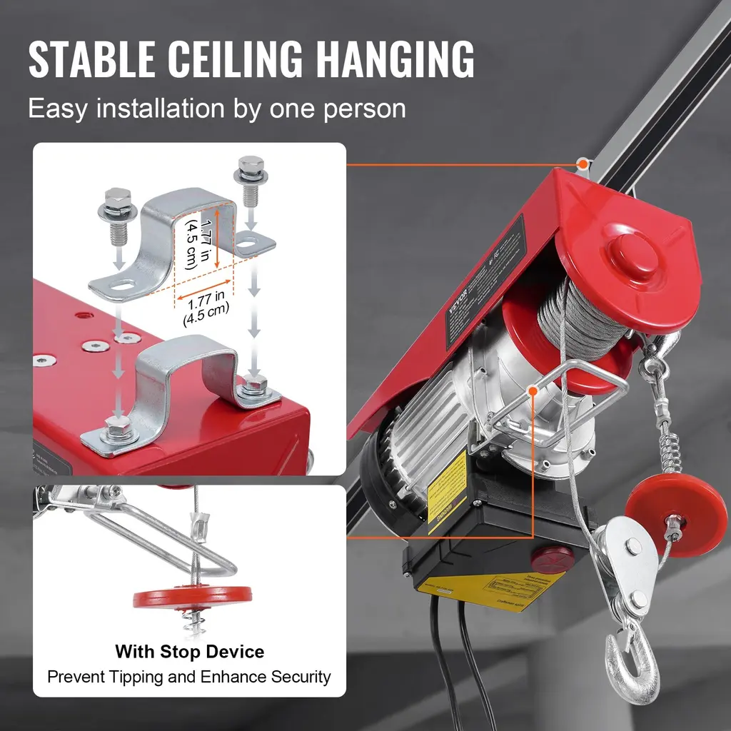 1320 lbs Load Capacity: This electric hoist can easily lift small engines, transmissions, large workshop tools, or construction supplies. Lifting Load Capacity: 660 lbs/300 kg (Single Cable), 1320 lbs/600 kg (Double Cable). Powerful Motor: The high-quality copper motor provides strong power, which can withstand large forces without causing deformation of the electric winch. In addition, the large cooling fan can quickly cool the machine to avoid overheating. Therefore, this powerful motor ensures efficient operation and saves you more time and energy. Convenient to Install: Our garage hoist can be directly hung on the ceiling using metal or solid wooden strips. Moreover, it is equipped with an emergency stop switch and an electromagnetic braking system to avoid abnormal sliding. Dual Control Options: With both wired and wireless remote controls, this ceiling lift puts you in charge. The wired remote reaches 14 ft (4.2 m), while the wireless one lets you work from up to 328 ft (100 m) away. It provides a great switch function that allows one-handed operation to lift, lower, and place the equipment. Multiple Uses: This electric cable hoist is widely used in garages, factories, warehouses, and families, as well as professionals and amateurs. It is suitable for repairing ships, cars, lawnmowers, golf carts, home decor, engines, boulders, trees, etc. Package Content 1 x Electric Hoist 1 x Accessory Kit