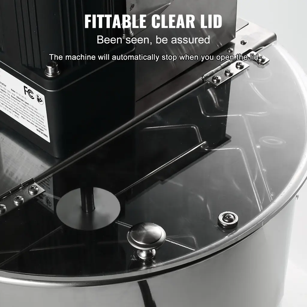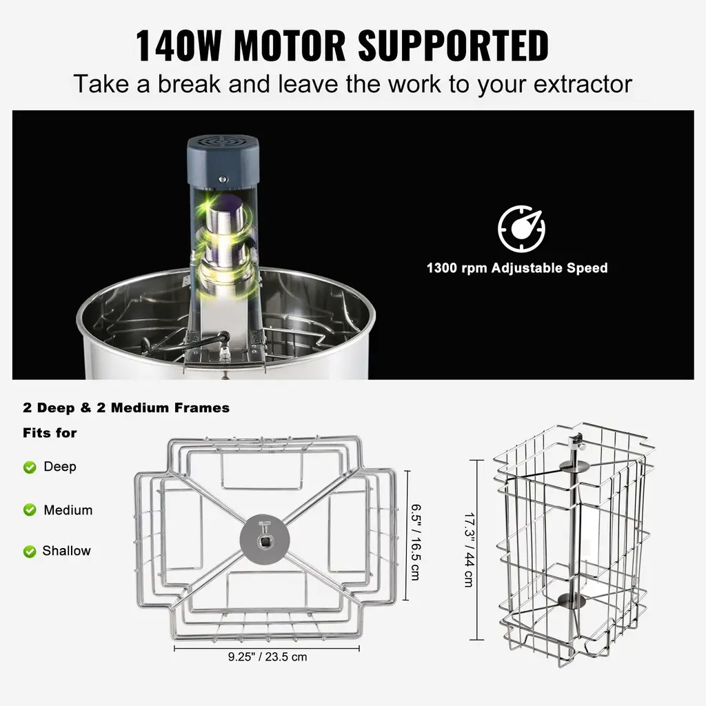 2/4 Frame Electric Honey Extractor: With a capacity to hold up to 2 deep frames and 2 medium or shallow frames, this extractor is the perfect addition to your kitchen or basement. Adapted Honeycomb Size: Deep: 18.9'' x 9'' / 48 x 23 cm and Medium: 18.9'' x 6.3'' / 48 x 16 cm. It's time to enjoy the sweetest harvest of your life with our honey spinner extractor! More Time to Relax: Get ready to enjoy effortless and efficient bee honey extractor with our powerful 140W extractor! Say goodbye to manual hand cranking. With an adjustable speed of up to 1300 rpm, this extractor will make quick work of your frames, saving your arms and back from exhaustion. Simply load your frames and let this honey bee extractor do the heavy lifting for you. Polished Stainless Steel: Its rust-resistant design makes cleaning a breeze, ensuring your extractor stays in pristine condition for years to come. The polished look adds a touch of style to your kitchen or basement, and the hand-friendly design will make every extraction a joy. With proper care, this extractor will be a reliable and long-lasting addition to your beekeeping equipment. Firmer and Steadier: No more messy shaking! The extractor's height can be adjusted to your desired level, with a range of min. 39.3'' / 100 cm to max. 42.5'' / 108 cm. Keep your floor protected and your extractor easily accessible with legs that can be bolted to a piece of plywood. This feature not only keeps the barrel off the ground for easy draining, but it also allows you to work at a comfortable height. See Your Honey Move: Get ready to watch your honey flow with our clear lid extractor! The lid allows you to easily monitor the progress of your extraction. We've designed this electric honey spinner with safety in mind. If the lid is opened during extraction, the shaker will automatically stop, giving you peace of mind and a pleasant honey harvesting experience. Package Content 1 x Honey Extractor 1 x User Manual
