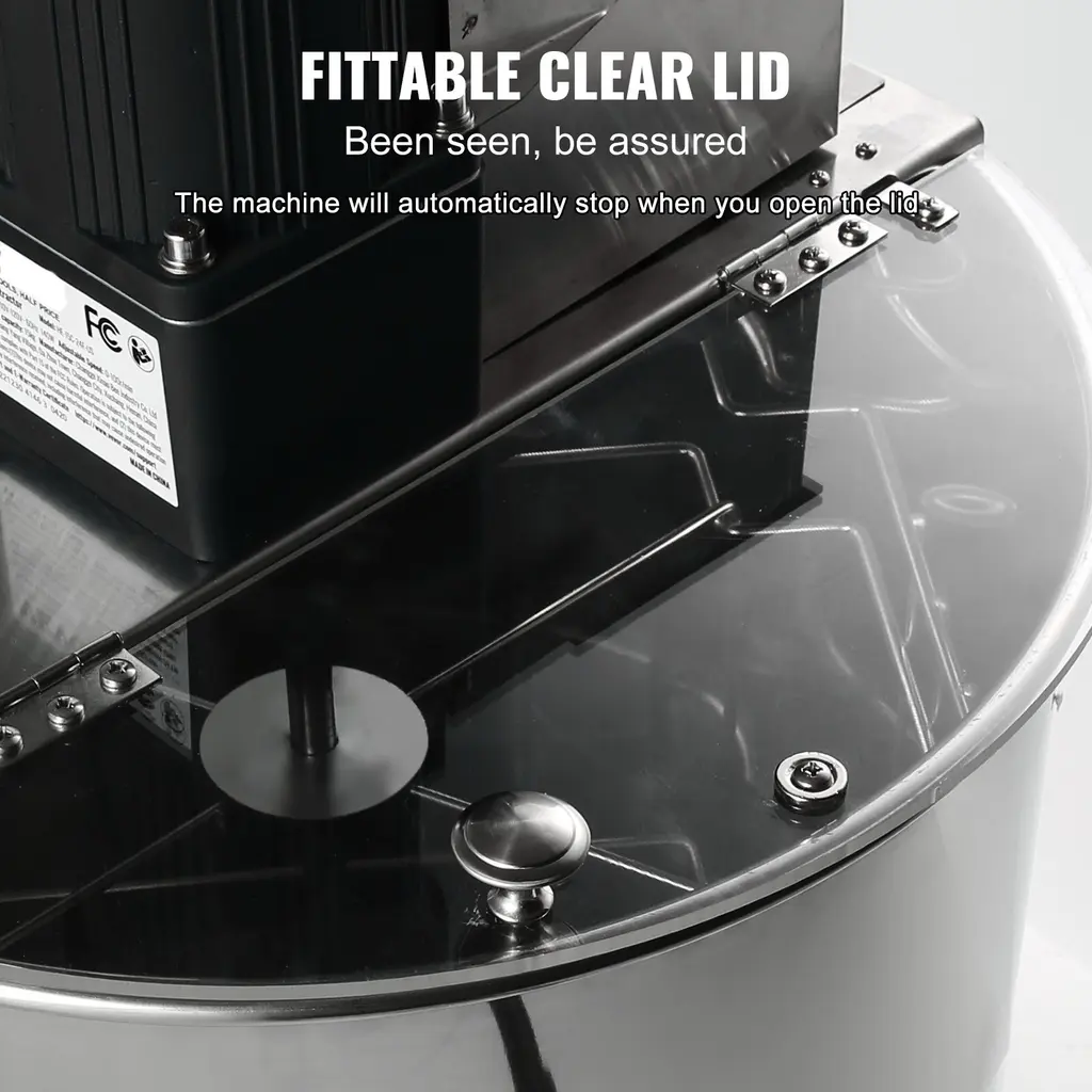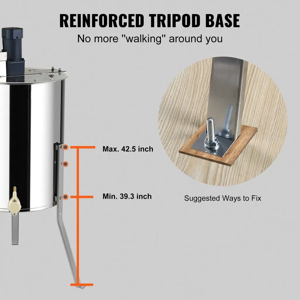 4/8 Frame Electric Honey Extractor: With a capacity to hold up to 4 deep frames and 4 medium or shallow frames, this extractor is the perfect addition to your kitchen or basement. Adapted Honeycomb Size: Deep: 18.9'' x 9'' / 48 x 23 cm and Medium: 18.9'' x 6.3'' / 48 x 16 cm. It's time to enjoy the sweetest harvest of your life with our honey spinner extractor! More Time to Relax: Get ready to enjoy effortless and efficient bee honey extractor with our powerful 140W extractor! Say goodbye to manual hand cranking. With an adjustable speed of up to 1300 rpm, this extractor will make quick work of your frames, saving your arms and back from exhaustion. Simply load your frames and let this honey bee extractor do the heavy lifting for you. Polished Stainless Steel: Its rust-resistant design makes cleaning a breeze, ensuring your extractor stays in pristine condition for years to come. The polished look adds a touch of style to your kitchen or basement, and the hand-friendly design will make every extraction a joy. With proper care, this extractor will be a reliable and long-lasting addition to your beekeeping equipment. Firmer and Steadier: No more messy shaking! The extractor's height can be adjusted to your desired level, with a range of min. 39.3'' / 100 cm to max. 42.5'' / 108 cm. Keep your floor protected and your extractor easily accessible with legs that can be bolted to a piece of plywood. This feature not only keeps the barrel off the ground for easy draining, but it also allows you to work at a comfortable height. See Your Honey Move: Get ready to watch your honey flow with our clear lid extractor! The lid allows you to easily monitor the progress of your extraction. We've designed this electric honey spinner with safety in mind. If the lid is opened during extraction, the shaker will automatically stop, giving you peace of mind and a pleasant honey harvesting experience. Package Content 1 x Honey Extractor 1 x User Manual