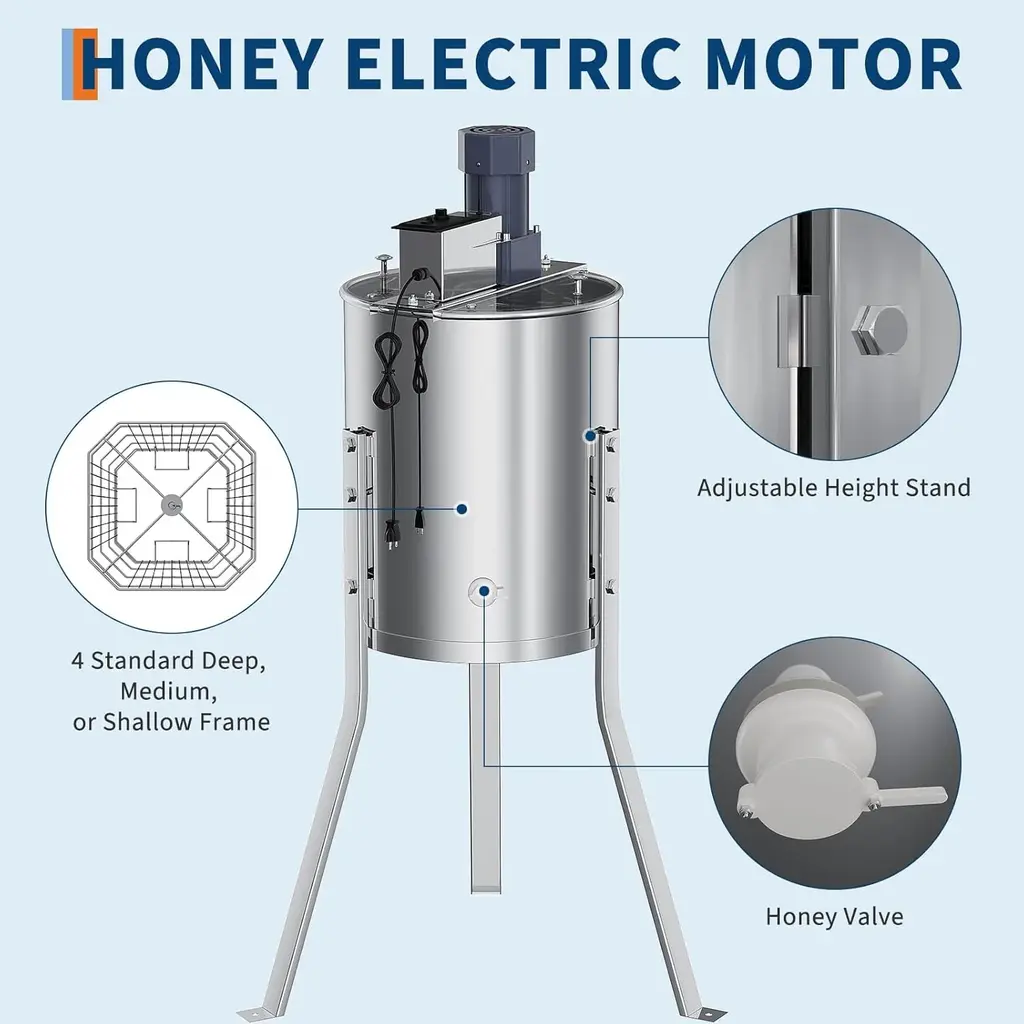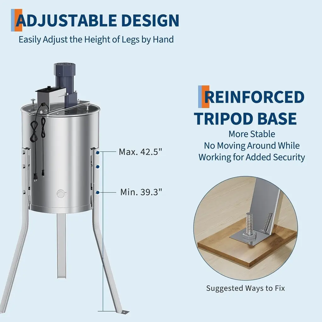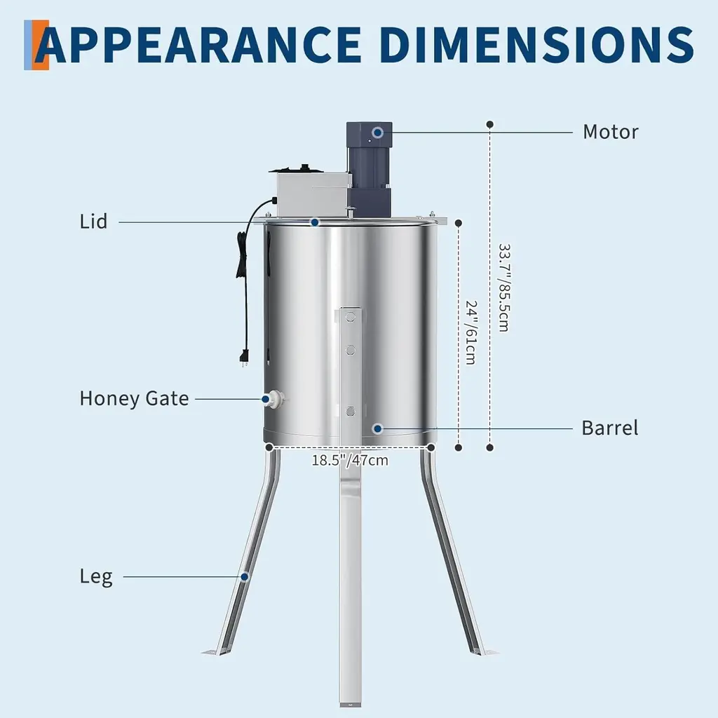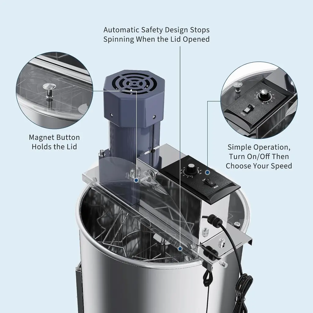 Efficient 2/4 Frame Honey Extraction – This electric honey extractor is designed to handle 2 deep or 4 medium frames, offering a fast and convenient way for hobbyists and professional beekeepers to harvest honey with ease. 140W Powerful Motor with Adjustable Speeds – Equipped with a robust 140W motor, this honey spinner features adjustable speeds up to 1300 RPM, making honey extraction quick, efficient, and effortless, eliminating the need for manual cranking. Heavy-Duty Stainless Steel Construction – Built from food-grade stainless steel, this honey extractor is rust-resistant, easy to clean, and highly durable, ensuring a long-lasting investment for your beekeeping needs. Stable & Adjustable Height – The honey extractor features an adjustable height range of 39.3" to 42.5" for comfort during operation. Its bolted legs offer maximum stability, preventing shaking or movement while extracting honey. Transparent Safety Lid with Auto-Stop – The clear acrylic lid lets you monitor honey extraction in real-time. For safety, the motor automatically halts when the lid is opened, preventing accidents and enhancing user confidence.