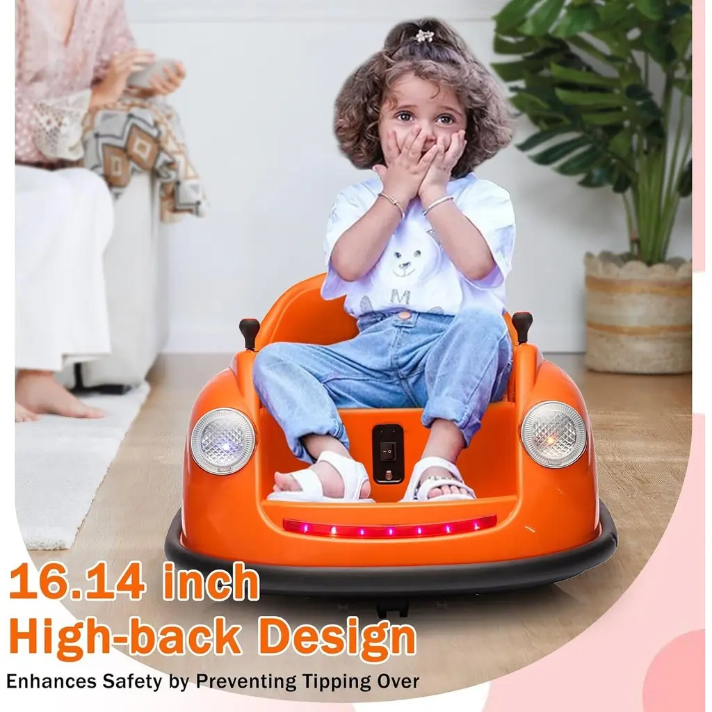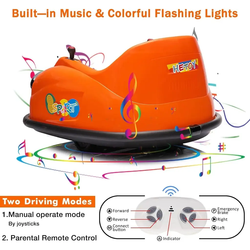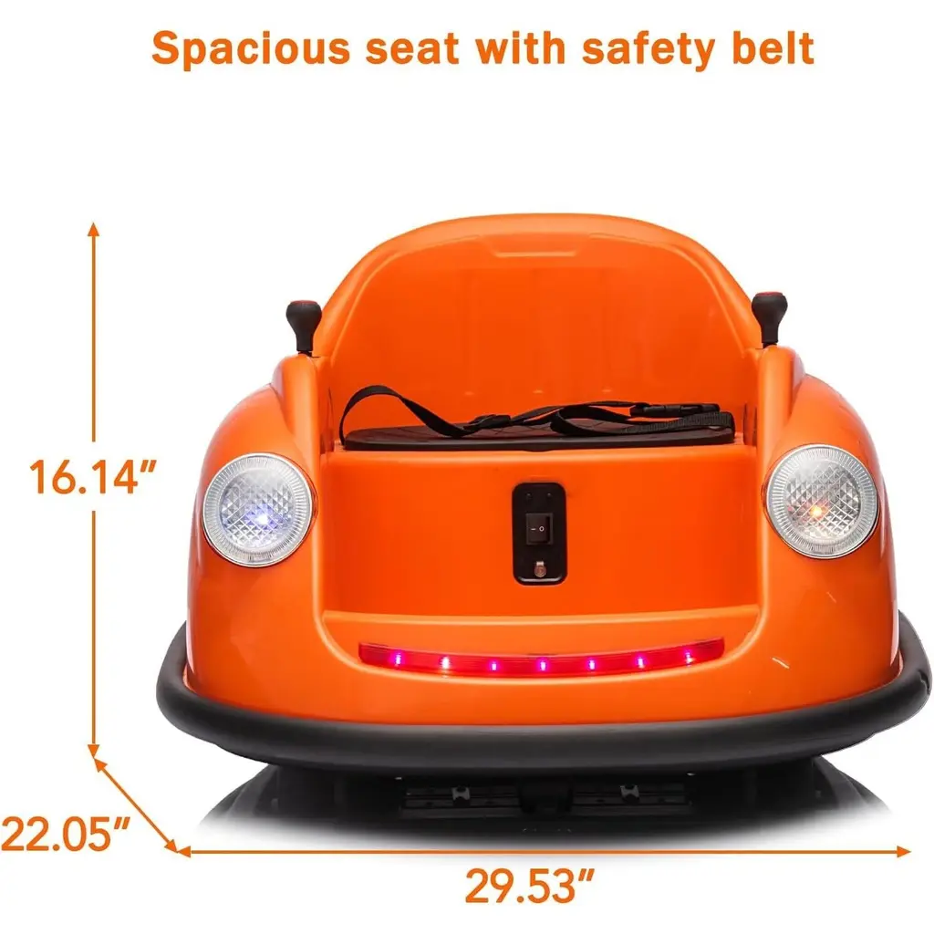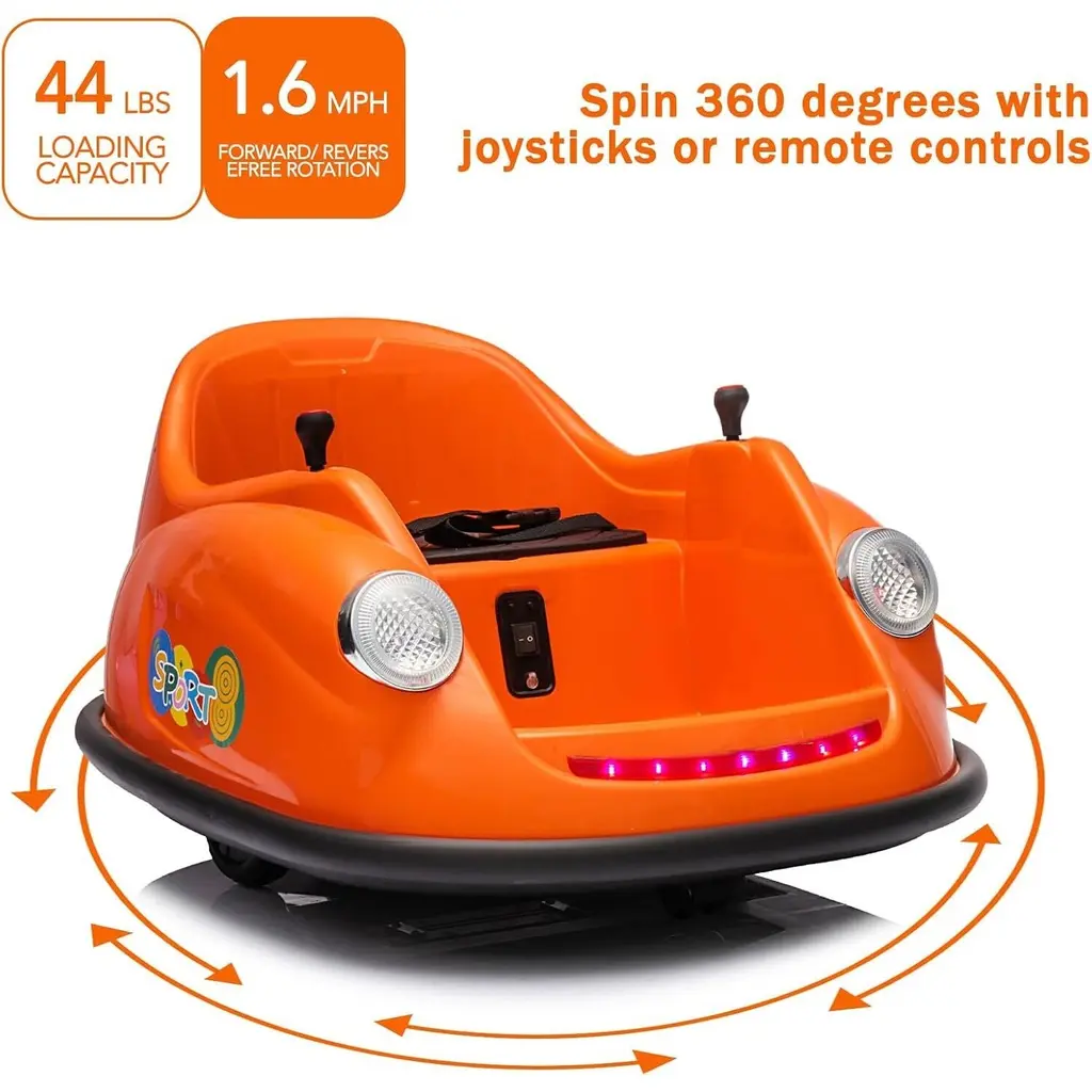 【MANUAL AND REMOTE CONTROL】Let your child drive manually or use the 2.4GHz remote control to guide them when necessary; the remote has forward/reverse and turn controls 【LIGHTS & SOUNDS】A set of functional lights conveniently located on a seat-mounted control panel adds an extra, realistic touch to playtime!Whether for a birthday, holiday, or any other special occasion, this gift is guaranteed to bring joy and excitement to your child's life. 【360 DEGREE SPIN】Bumper car with 360-degree spin for more smiles and greater riding fun. Ideal for toddlers and kids aged 1.5-6 years with a maximum weight capacity of 66 lbs. 【CLASSIC DESIGN】The smooth, curved profile combined with a thick rubber-like bumper and a fun set of vibrant stickers lets your child personalize their ride. It's the perfect birthday, holiday gift, or any other occasion. They will play endlessly and have a blast! 【PREMIUM PERFORMANCE】Includes a rechargeable 12V battery that lets your kids enjoy 1-3 hours of riding fun. Battery charging time is about 5 hours, and 12 hrs when charging for the first time.