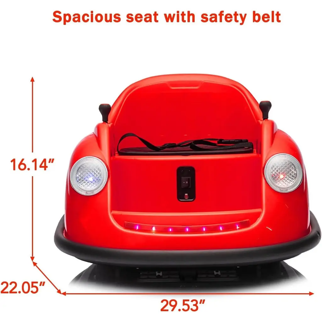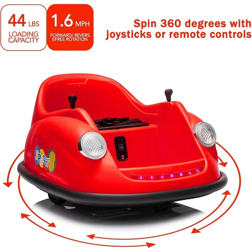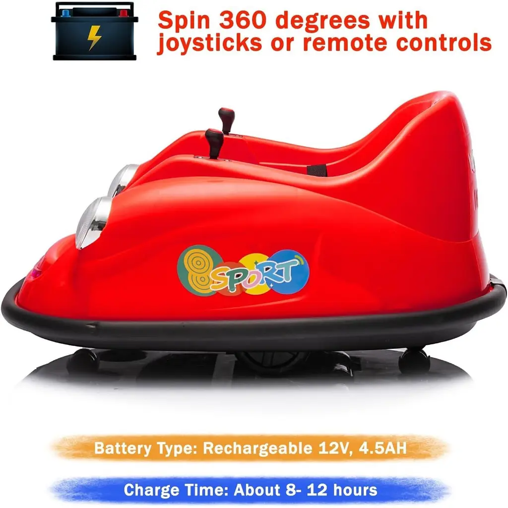 【MANUAL AND REMOTE CONTROL】Let your child drive manually or use the 2.4GHz remote control to guide them when necessary; the remote has forward/reverse and turn controls 【LIGHTS & SOUNDS】A set of functional lights conveniently located on a seat-mounted control panel adds an extra, realistic touch to playtime!Whether for a birthday, holiday, or any other special occasion, this gift is guaranteed to bring joy and excitement to your child's life. 【360 DEGREE SPIN】Bumper car with 360-degree spin for more smiles and greater riding fun. Ideal for toddlers and kids aged 1.5-6 years with a maximum weight capacity of 66 lbs. 【CLASSIC DESIGN】The smooth, curved profile combined with a thick rubber-like bumper and a fun set of vibrant stickers lets your child personalize their ride. It's the perfect birthday, holiday gift, or any other occasion. They will play endlessly and have a blast! 【PREMIUM PERFORMANCE】Includes a rechargeable 12V battery that lets your kids enjoy 1-3 hours of riding fun. Battery charging time is about 5 hours, and 12 hrs when charging for the first time.