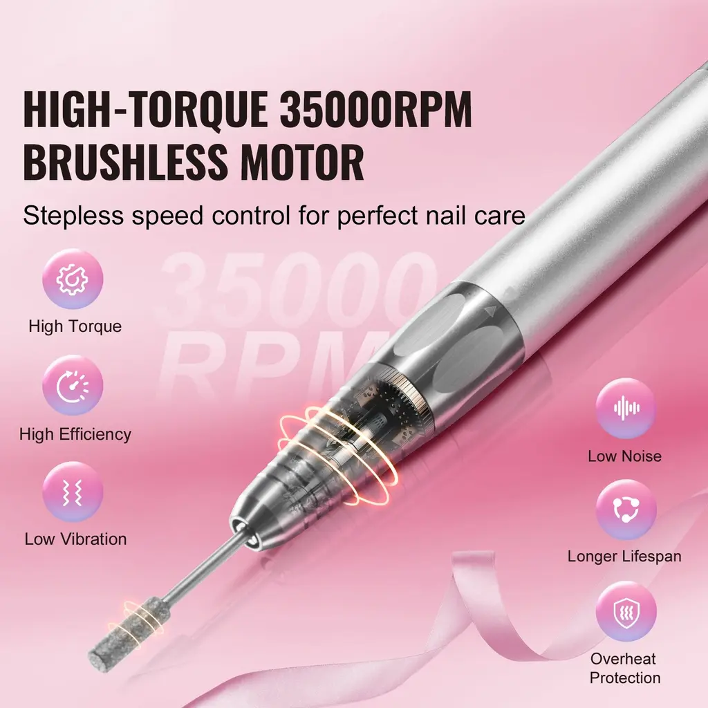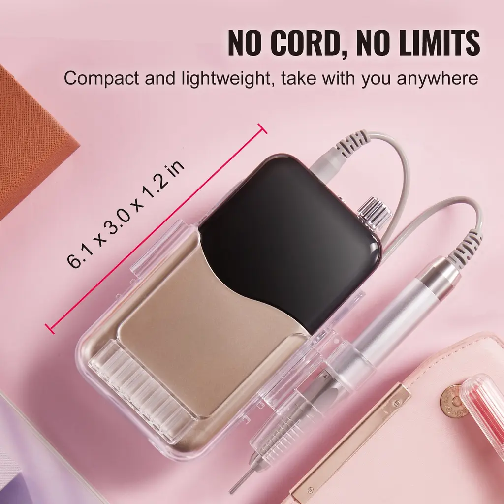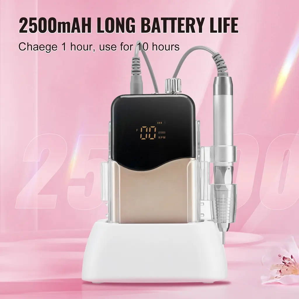 High Speed Up To 40,000RPM/35000RPM/30,000RPM & Variable Speed Control: electric cordless nail drill features a high-efficiency motor, reaching high speed of up to 40,000RPM/35000RPM/30,000RPM, ensuring smooth nail polishing with minimal vibration and noise. Whether you're polishing, shaping, or buffing nails, our variable-speed nail e-file machine meets your needs. Charge Less, Do More: With a high-capacity battery of up to 2600/2500 mAh/2000 mAh/650 mAh, this rechargeable cordless nail e-file can work continuously for up to 4.6/10/6/2 hours on a single charge, eliminating the hassle of frequent recharging. Its cordless and portable design allows you to do your nails anytime, anywhere, without being tethered by cords. Premium CNC Aluminum Construction: Crafted from high-quality aluminum, our manicure pedicure tool ensures excellent durability and stability for prolonged use. Its excellent heat dissipation properties prevent overheating, ensuring a longer lifespan for your nail drill. Beauty meets durability, creating joyful nail care moments ! High-Definition LCD Display: Stay informed and in control during nail work with our intelligent LCD display. Easily select your desired speed and monitor real-time operating status such as speed and battery level. Enjoy clear and easy-to-read information for a seamless nail care experience. The Ultimate Nail Care Companion: Included are 6 grinding bits and 50 sanding bands, providing you with everything you need to remove dead skin, gel polish, as well as smooth and refine nail surfaces to perfection. Our electric cordless nail file is perfect for beginners and professionals alike, catering to salons, at-home use, and DIY nail enthusiasts. Package Content 1 x Type-C Charging Cable 50PCS x Sanding Bands 1 x Nail Drill Holder 1 x Connecting Cable 1 x Rechargeable Nail Drill 1 x Set of Drill Bit Kit