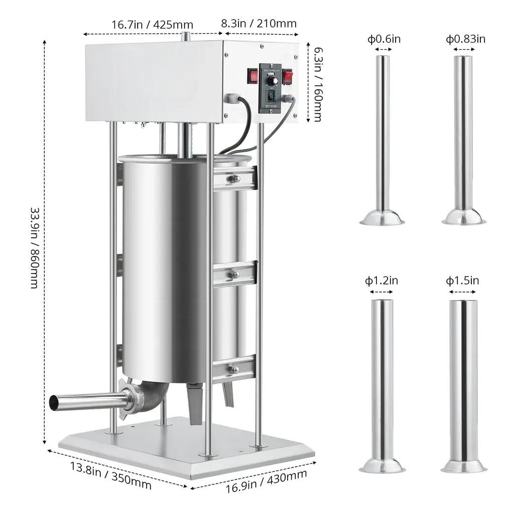 This electric sausage stuffer offers hands-free operation for a faster and more efficient stuffing process. Constructed from durable 304 stainless steel, it features two speed settings and includes five different-sized stuffing tubes, allowing you to create a wide variety of sausages with ease. Key Features: