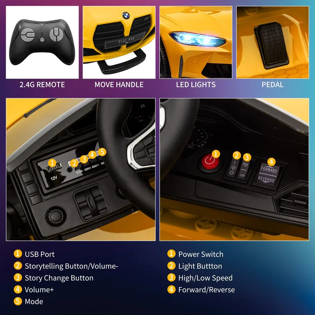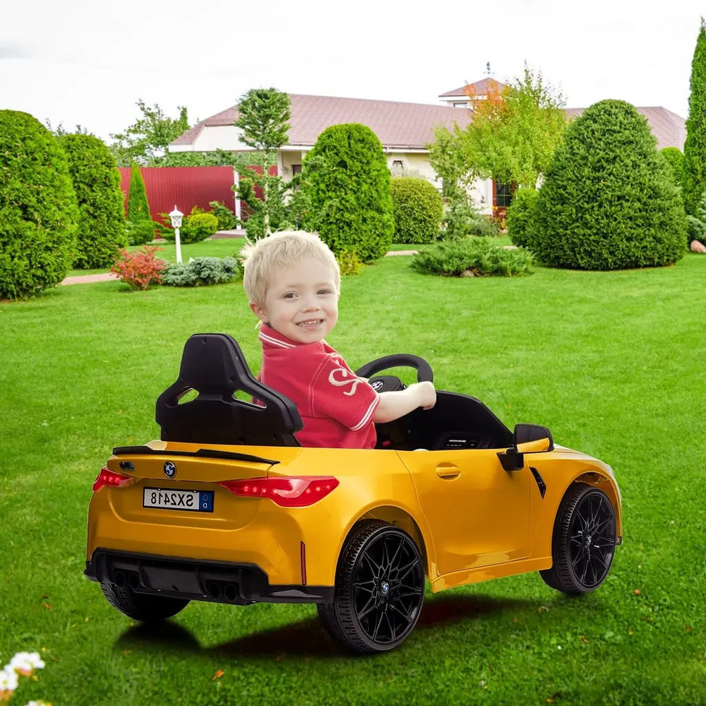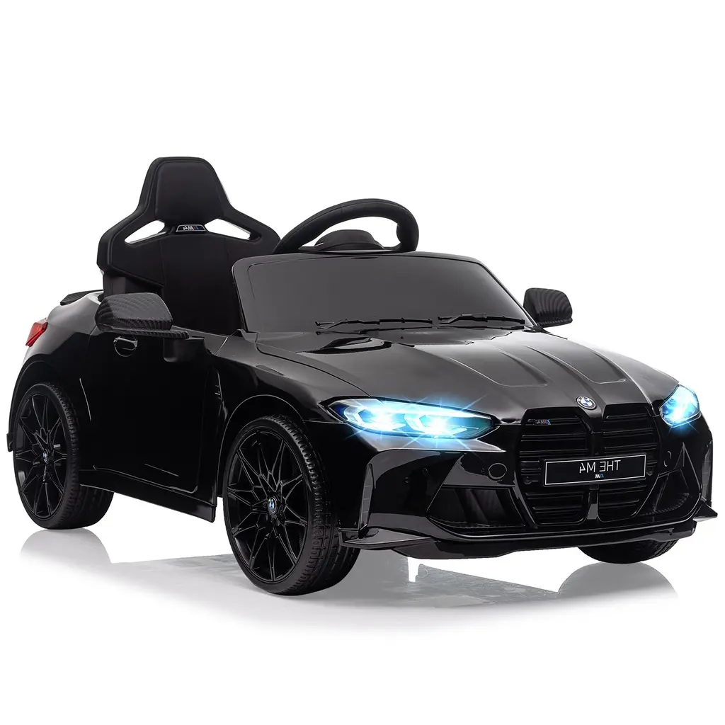 Officially Licensed BMW Design: This 12V kids ride-on car features an authentic BMW M4 design, providing an immersive driving experience with its realistic appearance. The built-in handle and wheels make it easy for parents to transport the car to and from play areas. Dual Control Modes for Fun & Safety: The ride-on car offers two driving options: children can independently operate the car using the pedals and steering wheel, helping them develop physical coordination, or parents can take control using the 2.4GHz remote control for safety. This feature encourages shared moments of fun between parents and kids. Enhanced Safety Features: Constructed from high-quality, child-safe PP material, this ride-on car includes slow start and brake technology to provide a smooth, steady ride that doesn't startle young drivers. The comfortable seat is equipped with a safety belt, while wear-resistant wheels and a suspension system ensure stable driving on various terrains. Luxury Entertainment Experience: The BMW M4 ride-on car is equipped with premium features such as bright LED headlights and luxurious seating to enhance the driving experience. Kids can enjoy their favorite music during rides through Bluetooth, USB, and AUX ports, adding an extra layer of enjoyment to their adventures. Perfect Gift for Young Adventurers: Ideal for birthdays, holidays, and special occasions, this 12V electric ride-on car is a fantastic gift for little drivers. It encourages outdoor exploration and fosters independence while helping create lasting memories between parents and children, ensuring hours of joy and excitement.