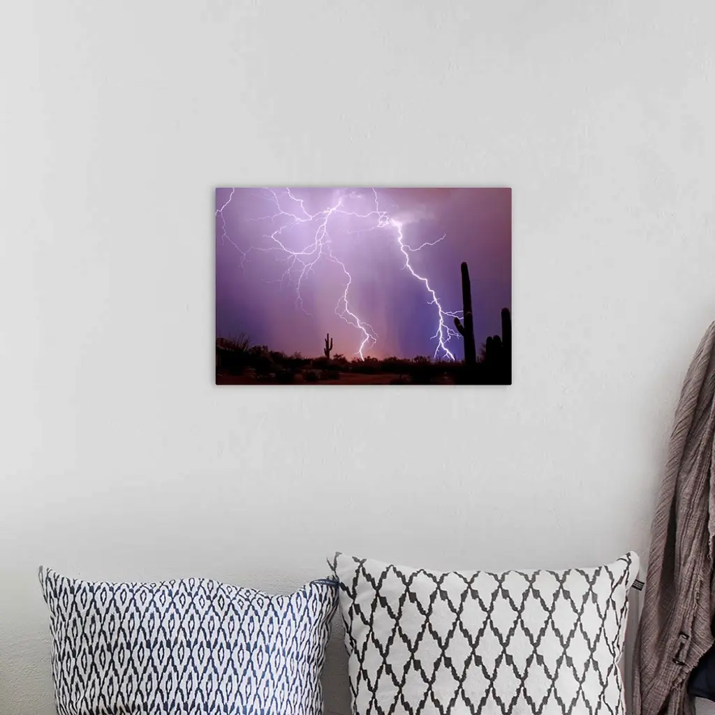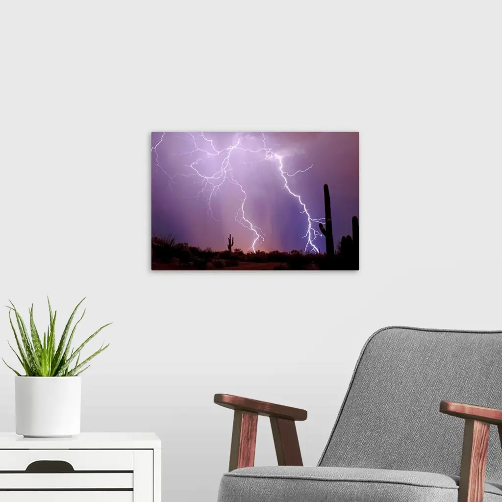 Photograph of lightning bolts in a purple sky with a desert silhouette in the foreground.