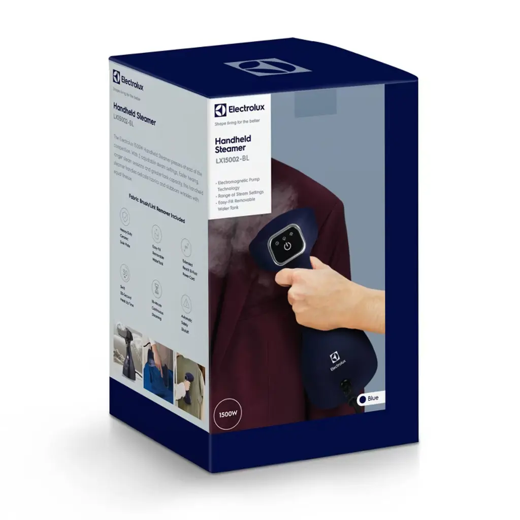 Product DescriptionRefresh clothes in minutes with the Electrolux 1500W Handheld Garment Steamer. It heats up in just 30 seconds and provides up to 18 minutes of continuous steam to remove wrinkles from clothing, drapery, and upholstery. Designed for ease and performance, it features a detachable 300 mL water tank, ceramic soleplate, and two attachments—a fabric brush and a lint remover—for a crisp, polished finish. Use it vertically or horizontally without worrying about drips or leaks. Compact, powerful, and safe for all fabrics, this travel-friendly steamer is ideal for daily touch-ups, busy households, dorm life, and working professionals. 1500W of pump-steam powerHeats up in just 30 seconds for quick and powerful wrinkle removal Up to 18 minutes of continuous steamTackle multiple garments in one go without refilling No-drip ceramic soleplateDelivers smooth, even steam with an anti-drip design for vertical or horizontal use Two attachments includedFabric brush lifts fibers for deeper steam penetration; lint remover eliminates fuzz and pet hair Auto shut-off safetyAutomatically powers down when not in use or when water is low Travel and dorm-friendlyCompact and portable with a long 12-ft cord for easy reach and tight spaces Perfect for TravelCompact enough for suitcases, powerful enough for dress shirts. The Electrolux handheld steamer is your go-to for polished looks on the go—whether it’s for business trips, vacations, or weekend getaways.Dorm Room EssentialSkip the ironing board! This space-saving steamer is perfect for tight dorms. Quick to use, safe on all fabrics, and easy to store—an essential for college students who need fast wrinkle fixes before class.Busy Parent ApprovedStreamline your laundry routine with a steamer that keeps up with family life. Whether it's smoothing uniforms or refreshing outfits on the fly, this tool helps busy parents get more done with less stress.Work-From-Home ReadyTurn camera-ready in seconds. The fast heat-up and easy vertical steam make this steamer perfect for last-minute touch-ups before virtual meetings—all without leaving your home office.Go-to for Office DaysMake a great impression at work without the hassle. Ideal for daily outfits, suit jackets, or midweek refreshes, this steamer helps you step into the office looking sharp and professional.Remove wrinkles, refresh fabrics, and cleanse upholstery in no time with the Electrolux Handheld Steamer. Long 12-foot power cord Steam nozzle rests on a heavy-duty ceramic sole plate for safety and stability Large, detachable 300ml (10 oz.) water tank Auto shut-off when not in use Vertical and horizontal steaming options Compact and travel-friendly design Extreme Steam with 2 adjustable steam settings Works on a variety of fabrics: cotton, wool, silk, synthetic fibers, and more Refresh and revive: Clothing, bedding, curtains, and furniture — all wrinkle-free and renewed.Electrolux is committed to sustainability. Our products are designed to reduce household energy use and minimize environmental impact. We champion: Sustainable energy strategies Human rights initiatives Zero waste to landfill We strive to uphold global environmental sustainability.What's in the Box: Handheld Garment Steamer Lint Remover Fabric Brush Documentation & Warranty
