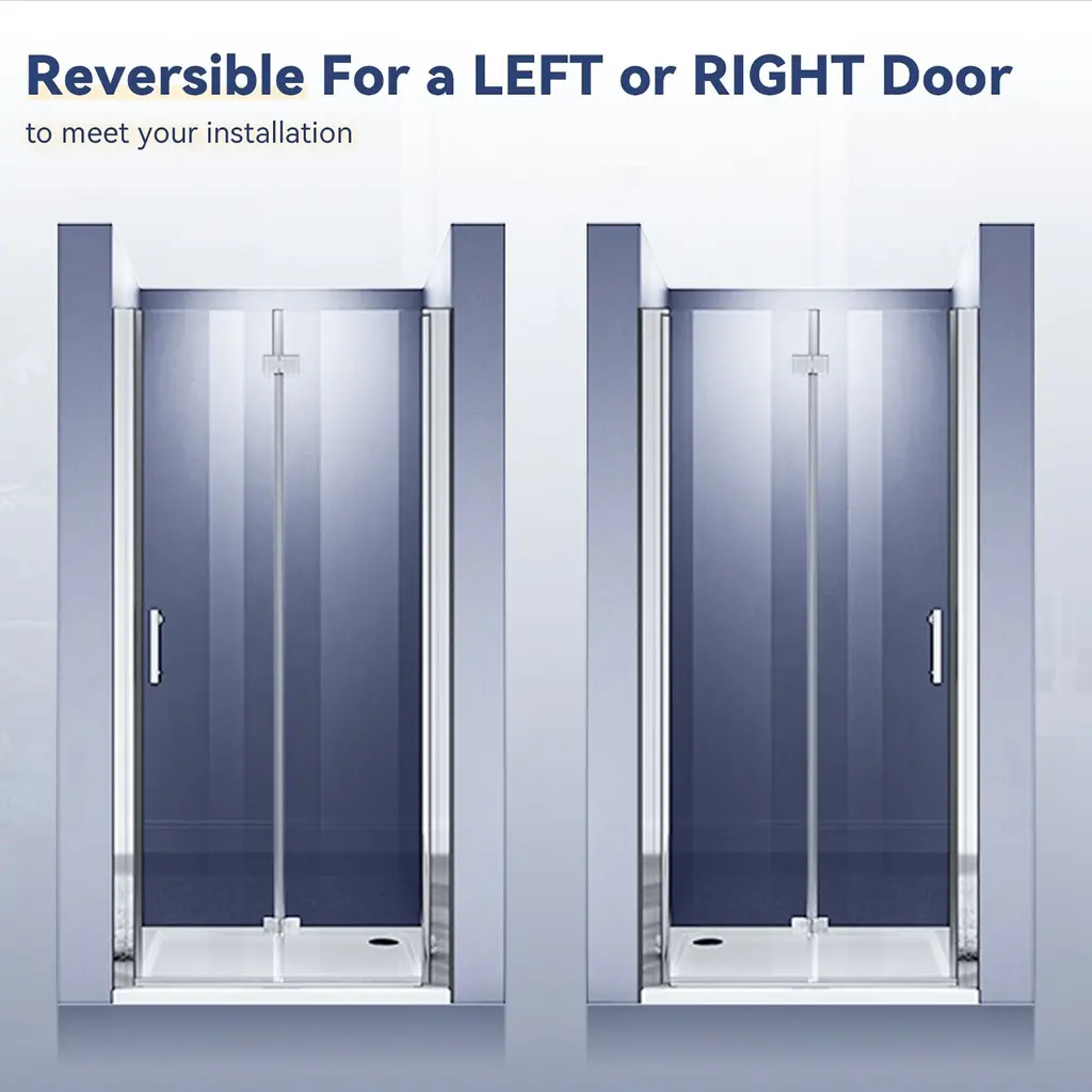 Our Bi-Fold Frameless Pivot Swing Shower Door Enclosure crafted with 1/4 inch clear certified tempered glass, this shower door is strong, durable and offers superior protection against water leaks. Its universal fitting design ensures a perfect waterproof seal every time. With a reversible installation for left or right, and high-quality chrome hinges that can rotate 180°, this shower door is easy to install and adjust. The vinyl magnetic shower door seal strips guarantee waterproof protection. When fully opened, the door overlaps, making it perfect for corners and saving space. Features:
