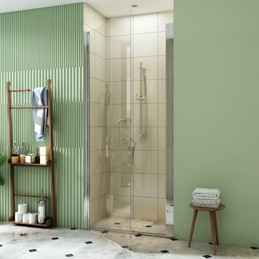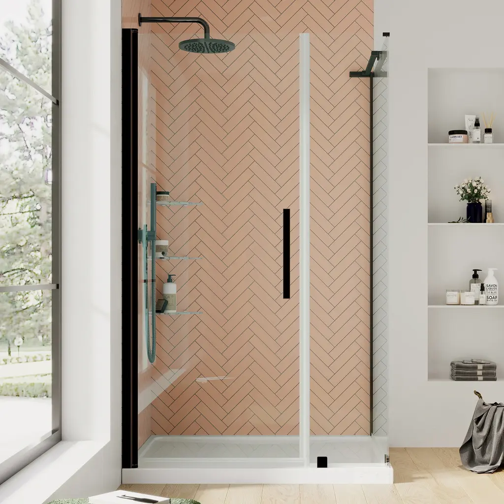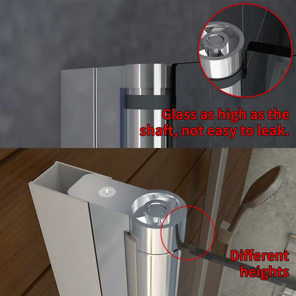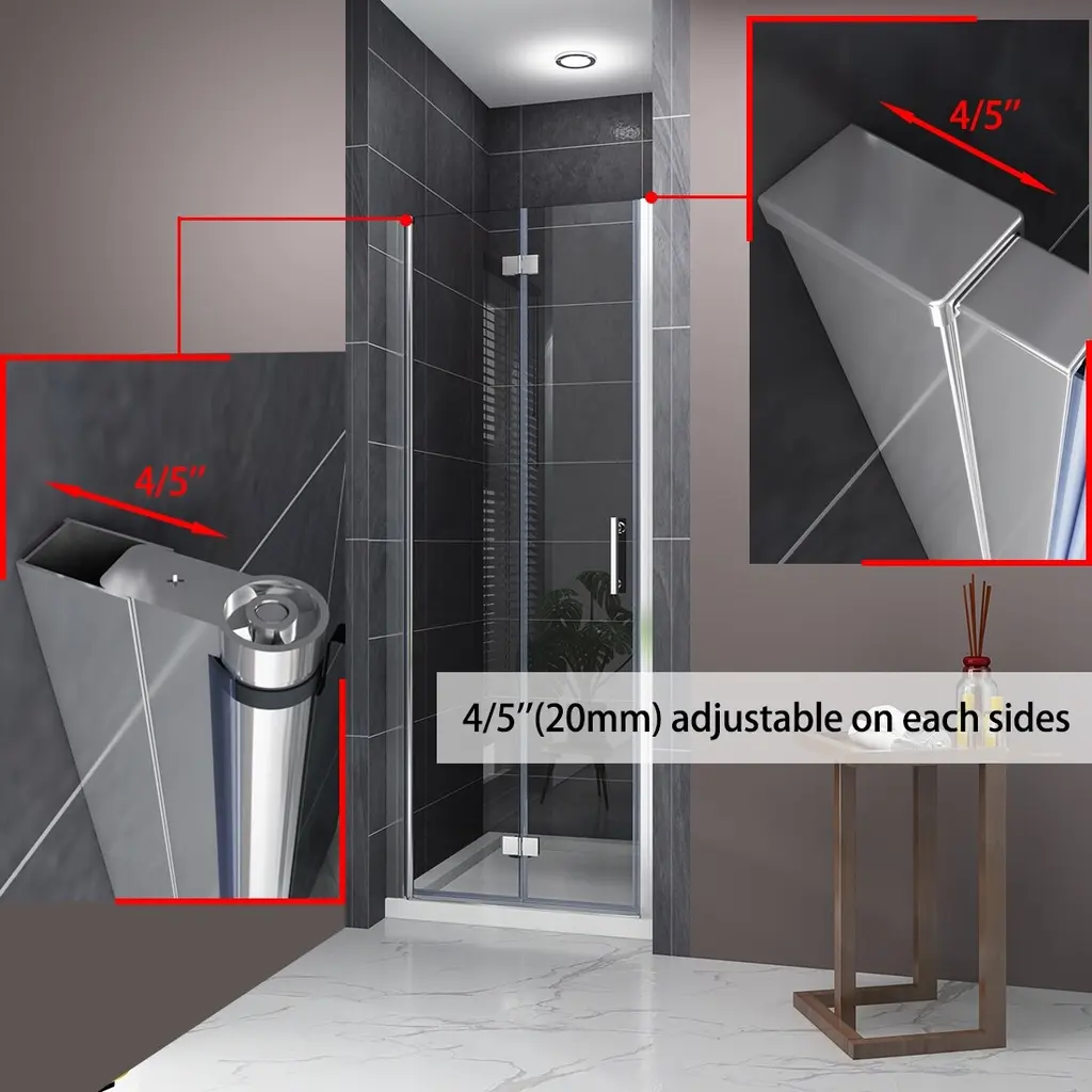 Elegant Bi-Fold Frameless Pivot Swing Shower Door Enclosure boasts a sleek and modern design that is both stylish and functional. Made with 1/4-inch clear certified tempered glass, this door is adjustable on each side to fit any bathroom layout. The chrome finish or matte options offer a trendy look, while the vinyl magnetic shower door seals strips provide a waterproof guarantee. The high-quality chrome hinges are flexible and can rotate 180° for added convenience. Plus, the overlapping design saves space when fully open. Choose from four different sizes and two color options to customize your bathroom. Professional installation is recommended. Features: