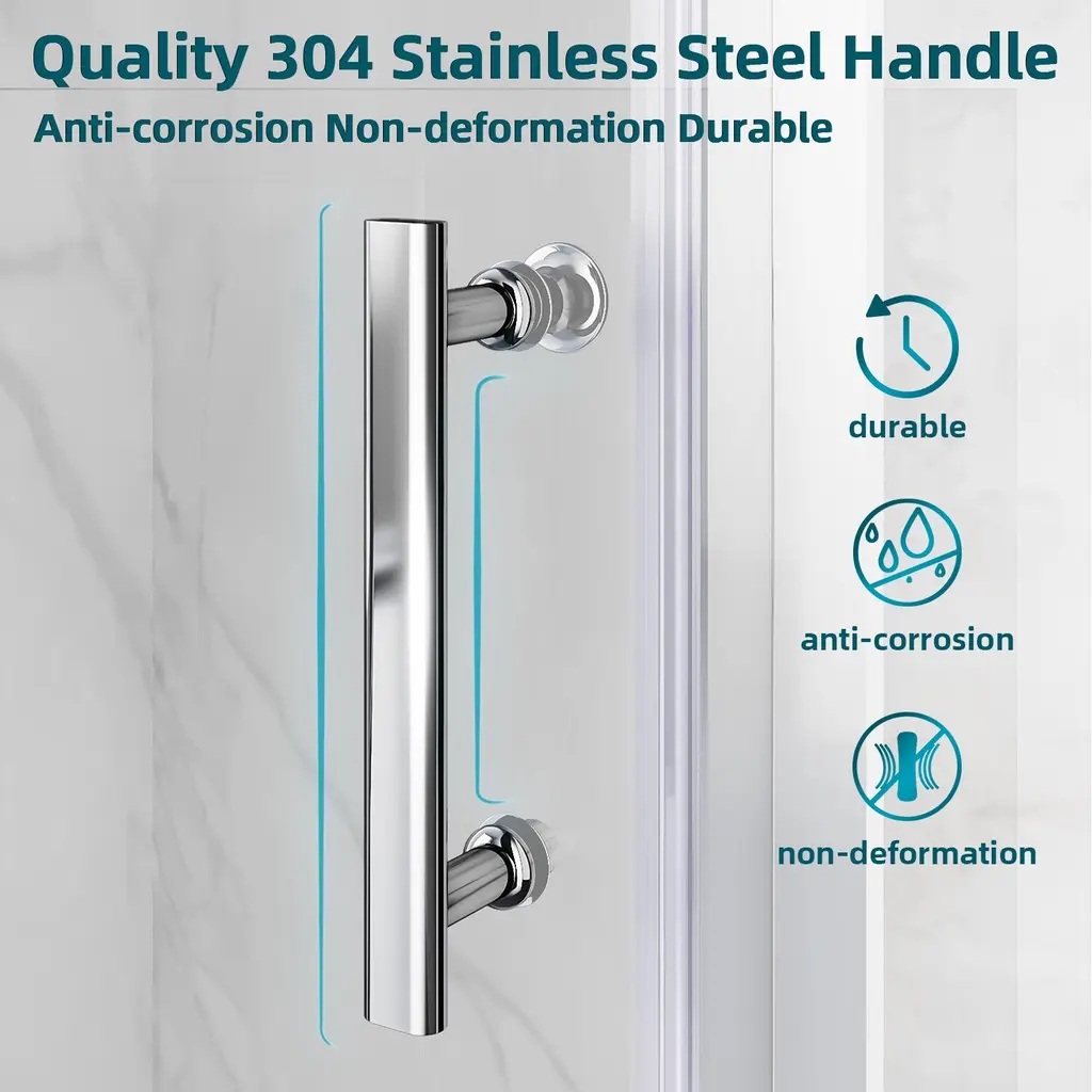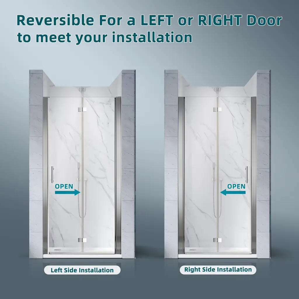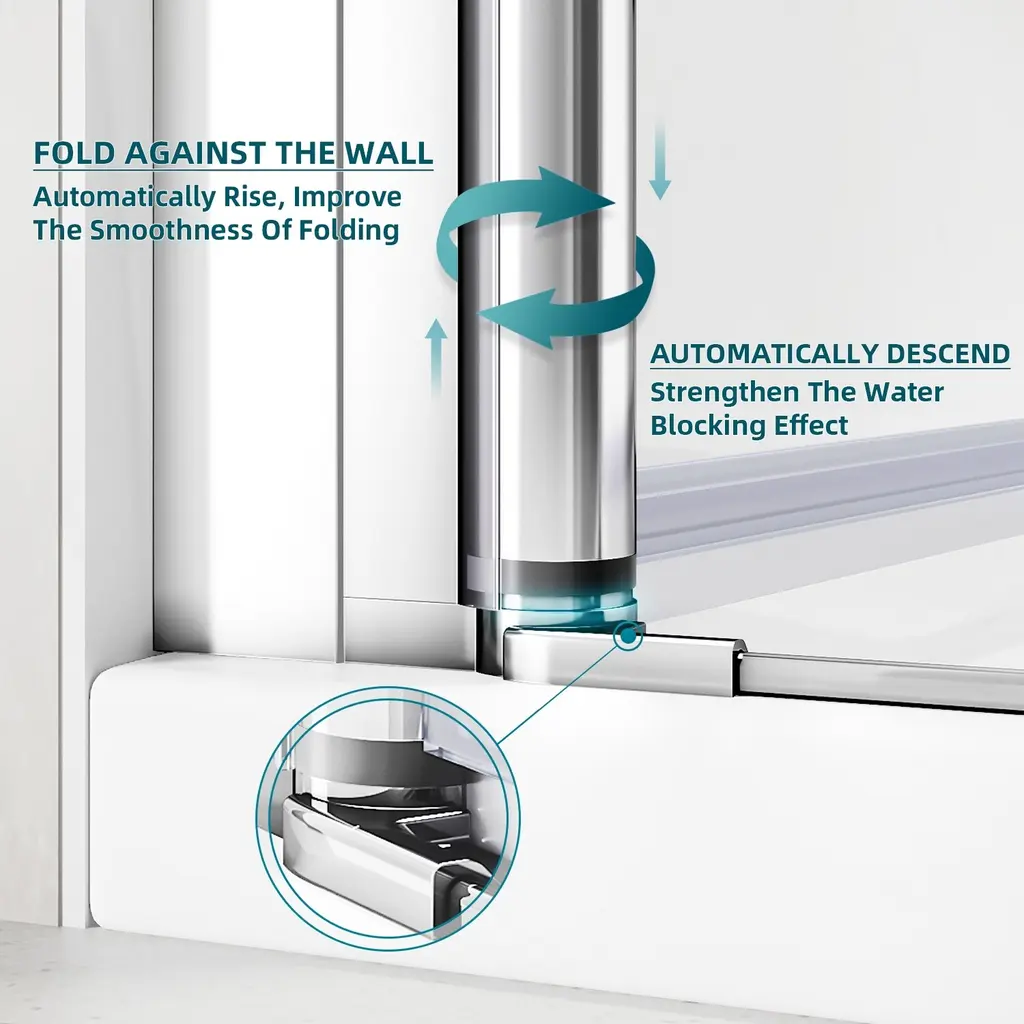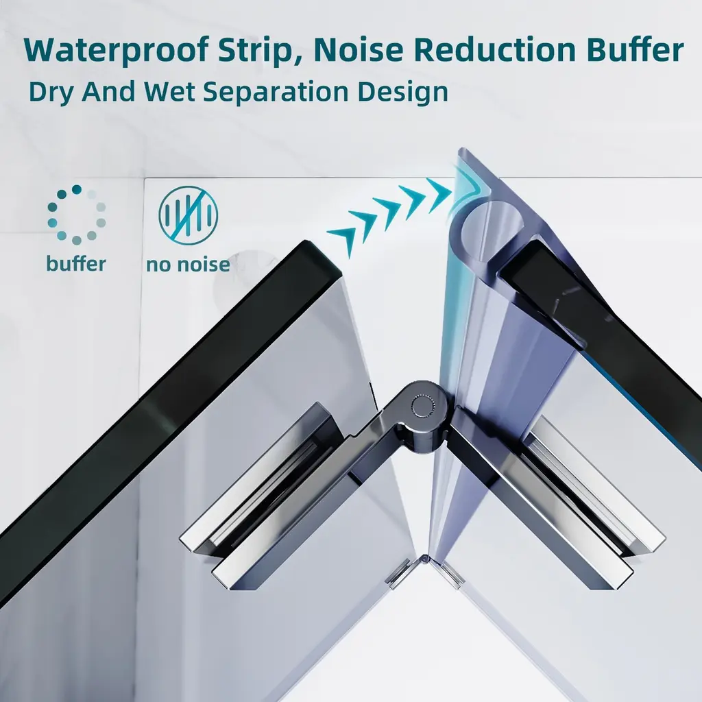 Bring a touch of elegance to your bathroom with our Elegant Bifold Frameless Glass Shower Door Black Shower Panel Pivot Swing Shower Doors. This shower door boasts a sleek and modern design that is both stylish and functional. This product showcases a bi-folding design equipped with hinges and pivots that facilitate a 180-degree overlapping swivel. This shower door is specifically designed to be installed in the corner of your bathroom, making it an ideal solution for compact spaces, ultimately contributing to efficient space utilization in smaller bathrooms. Specifications:Features: