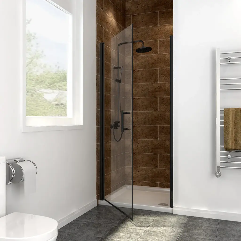 The Elegant Black Framed Adjustable Width Frameless Glass Door Pivot Swing Shower Door presents a sophisticated, frameless aesthetic and incorporates a 90-degree revolving door feature. This product serves as an invaluable asset for DIY designers seeking to elevate the style of any bathroom while maintaining budgetary considerations. Furthermore, its corner installation option offers an effective space-saving solution tailored for compact bathroom environments. Specifications:Features: