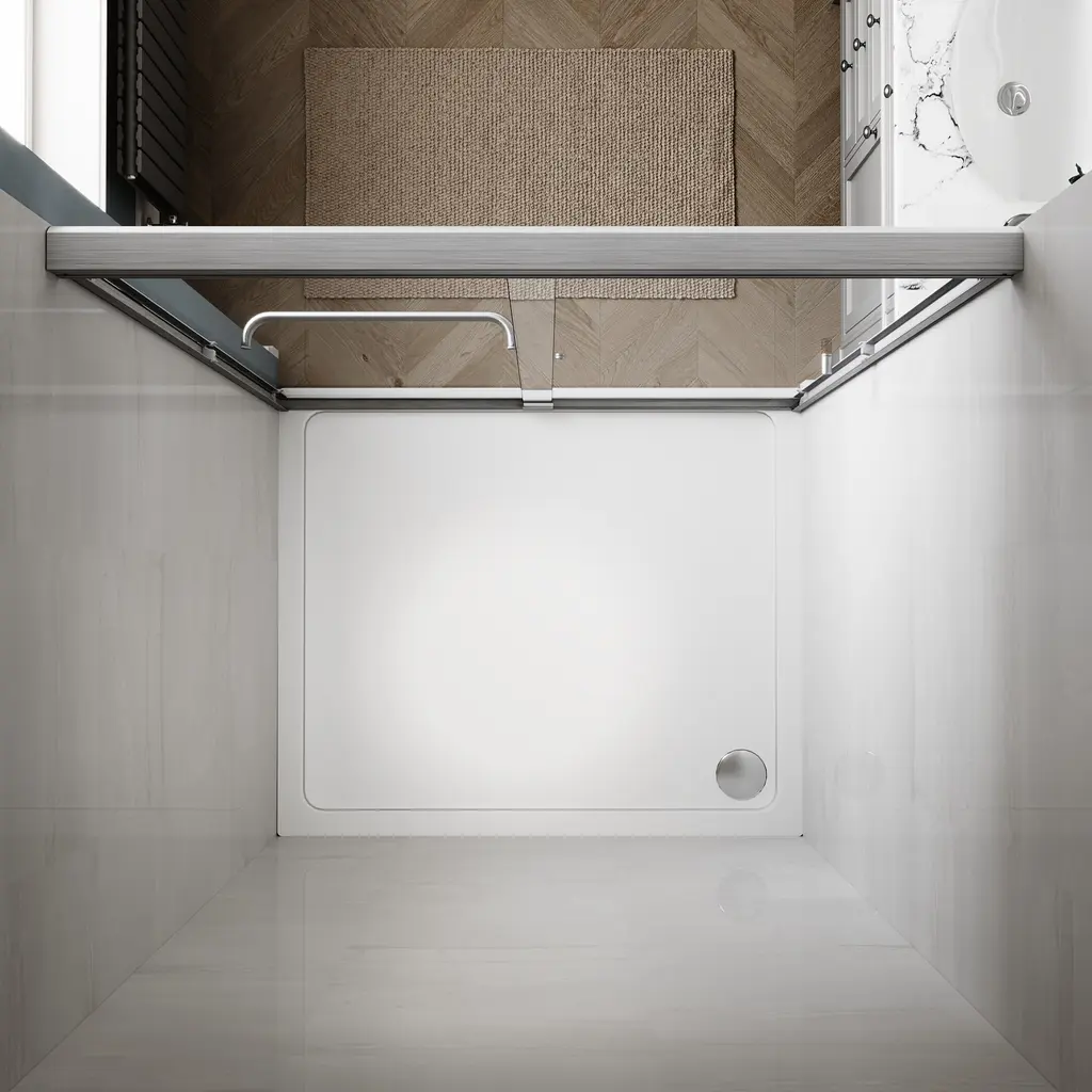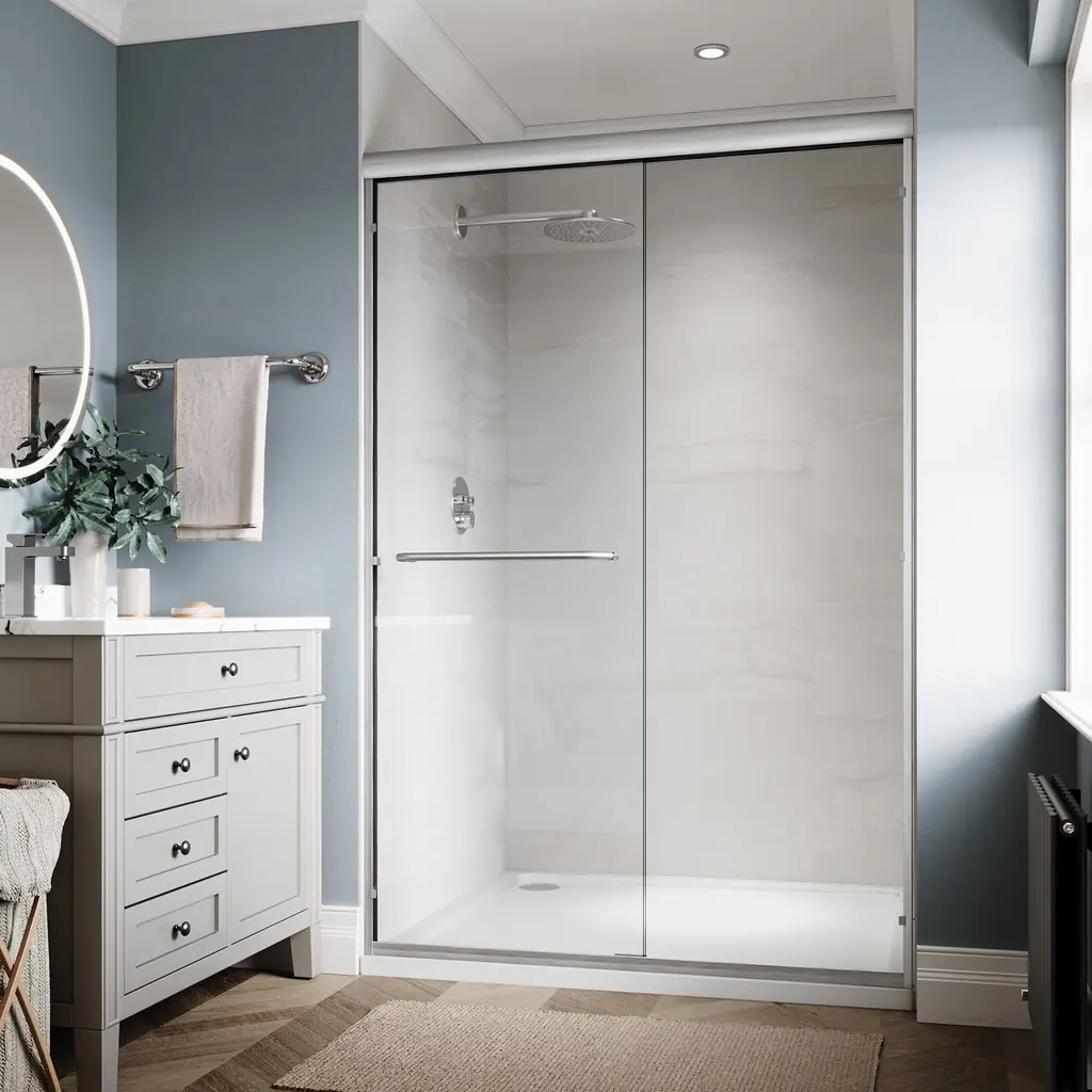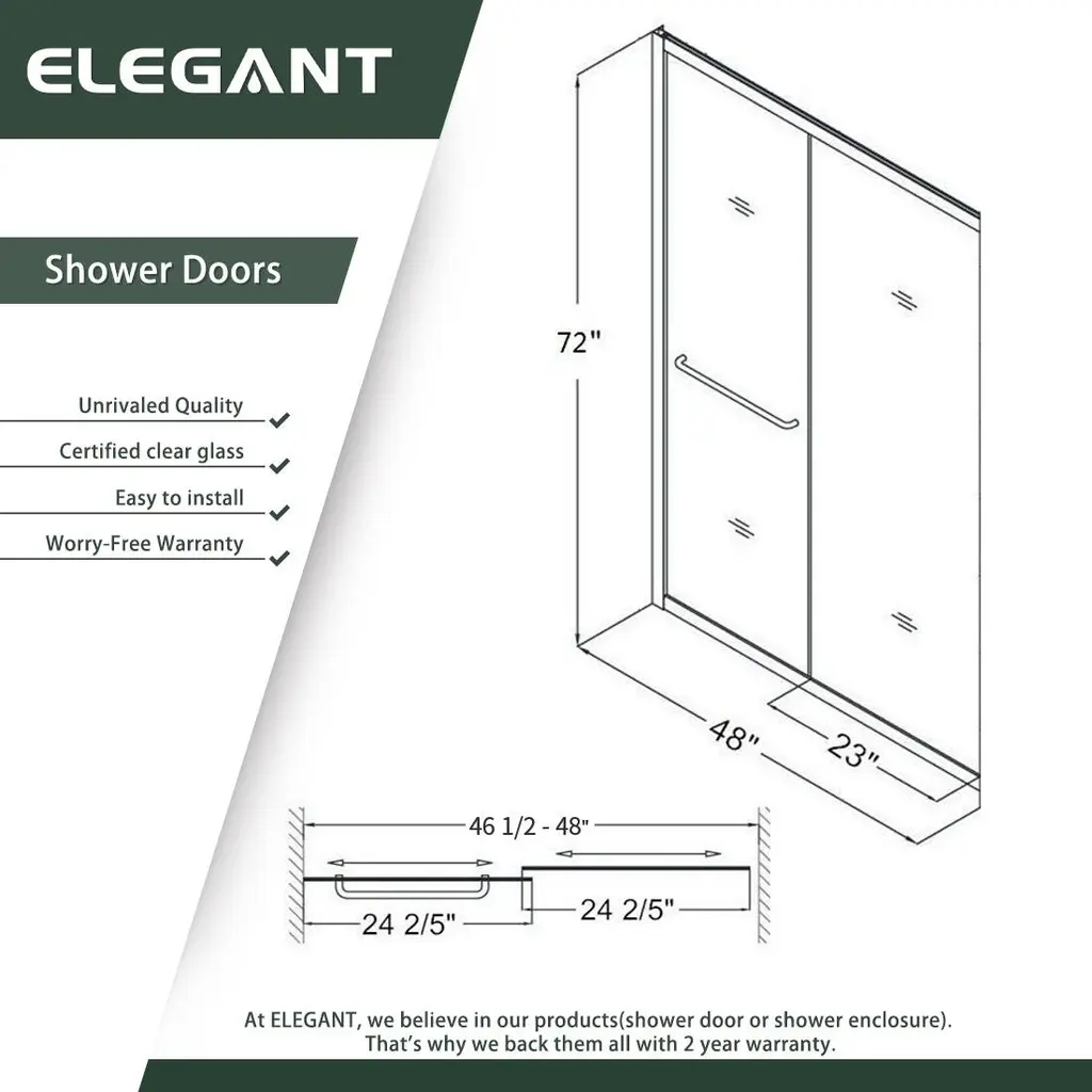 Elegant Double Sliding Shower Door 46.5 in.- 48 in. W x 72 in. H.This shower door is made of high quality aluminum for durability.The clear tempered glass is 1/4 inch thick and ANSI Z97.1 certified, ensuring safety and easy maintenance. Professional installation is recommended. Features: