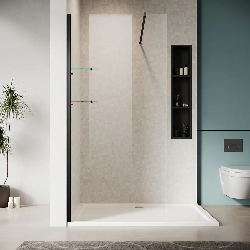 Our Elegant Frameless Fixed Glass Panel Shower Door creates your bathroom with a sense of simplicity and style. Featuring 5/16-inch (8mm) high-strength nano clear tempered glass, unbreakable and easy to clean.The frameless design eliminates the traditional bezel design and secures the panel with support bar for a solid, wobble-free installation.The 0.59-inch (15mm) adjustment range provides access to the shower area. Comes with two bathroom corner shelves for easy access to body wash, shampoo and other shower items.Sliver aluminum hardware adapts to any style of bathroom. Specifications:Features: