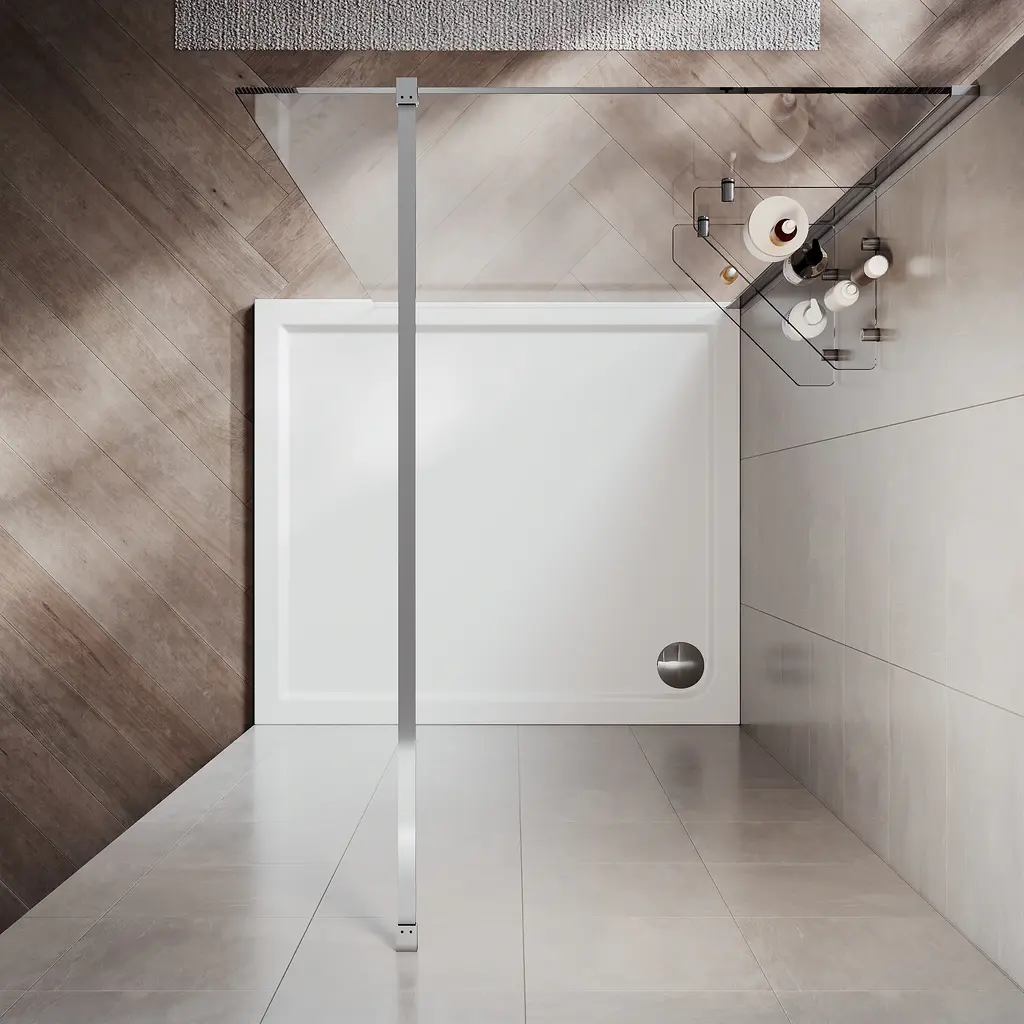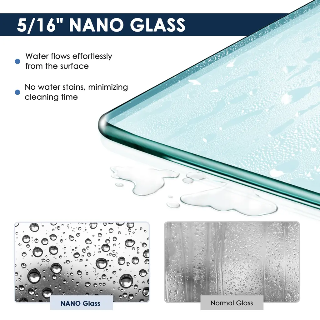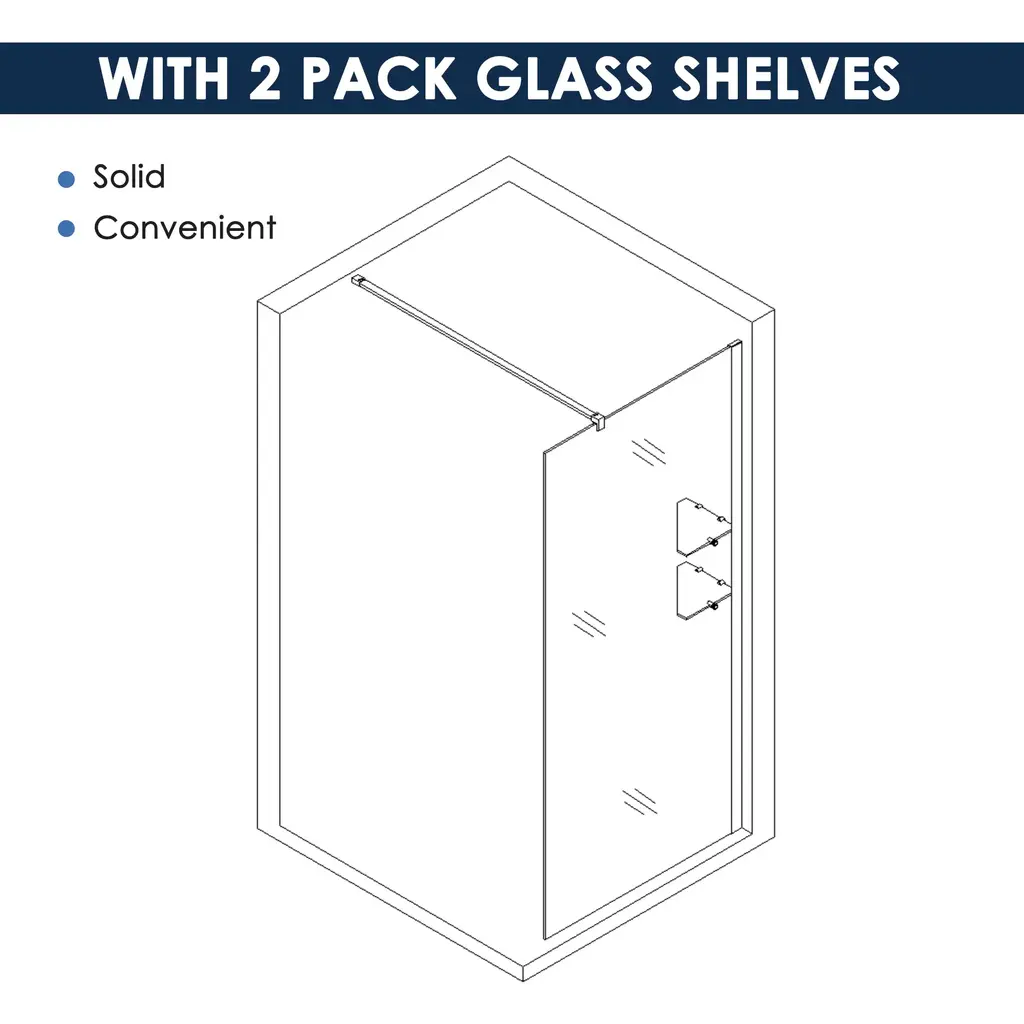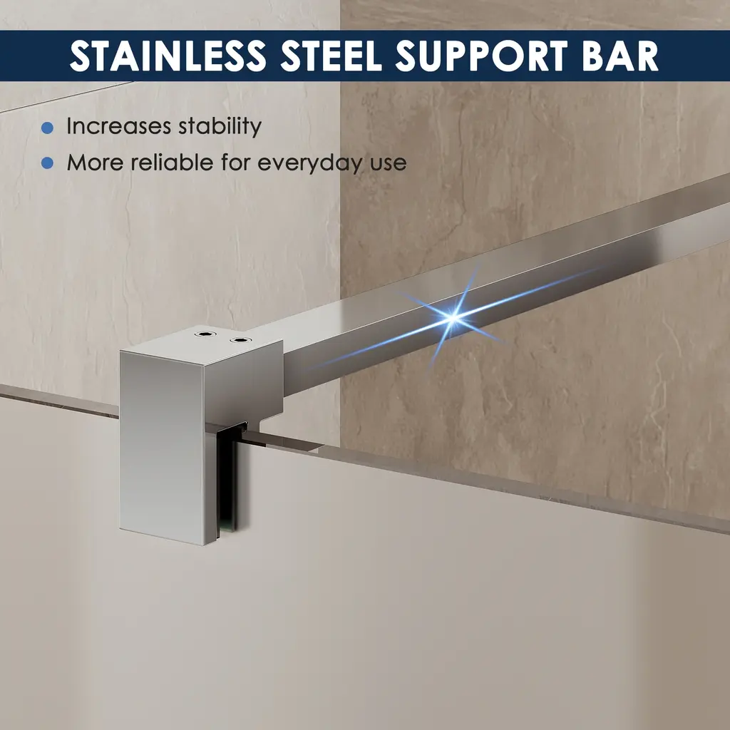 Our Elegant Frameless Fixed Glass Panel Shower Door creates your bathroom with a sense of simplicity and style. Featuring 5/16-inch (8mm) high-strength nano clear tempered glass, unbreakable and easy to clean.The frameless design eliminates the traditional bezel design and secures the panel with support bar for a solid, wobble-free installation.The 0.59-inch (15mm) adjustment range provides access to the shower area. Comes with two bathroom corner shelves for easy access to body wash, shampoo and other shower items.Sliver aluminum hardware adapts to any style of bathroom. Specifications:Features:
