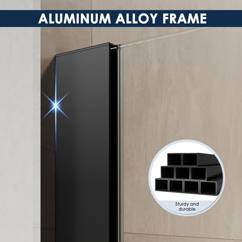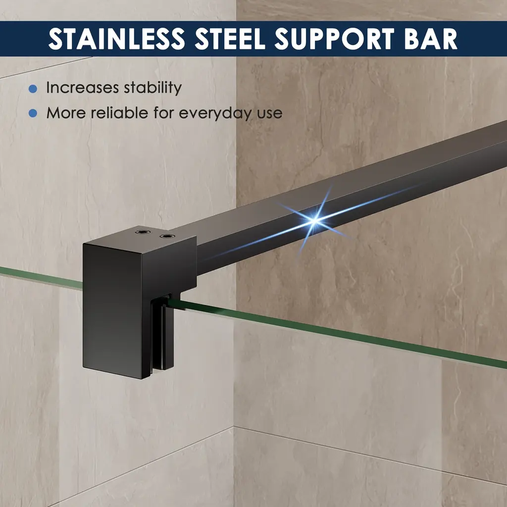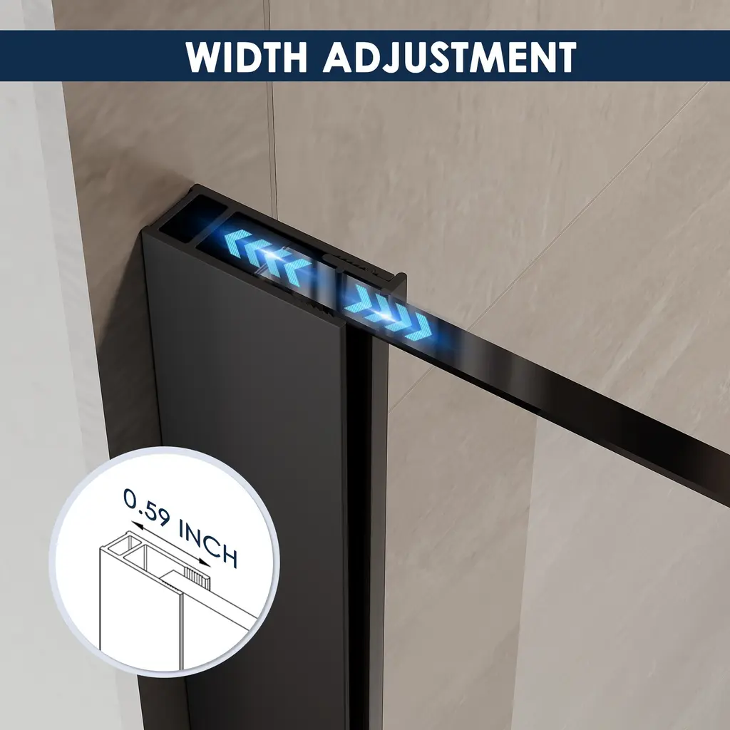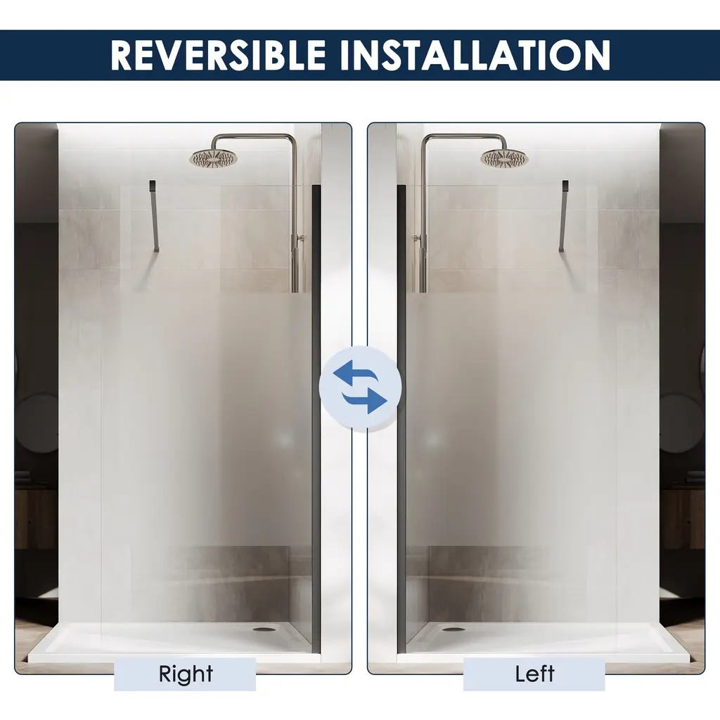 Our Elegant Frameless Signle Fixed Glass Panel Shower Door creates your bathroom with a sense of simplicity and style. Featuring 5/16-inch (8mm) high-strength nano-clear frosted glass throughout, the panel retains the openness of clear glass, while the frosted glass subtly obscures the view and protects privacy. The frameless design eliminates the traditional bezel design and secures the panel with support bar for a solid, wobble-free installation.The 0.59-inch (15mm) adjustment range provides access to the shower area. Black aluminum hardware adapts to any style of bathroom. Specifications:Features: