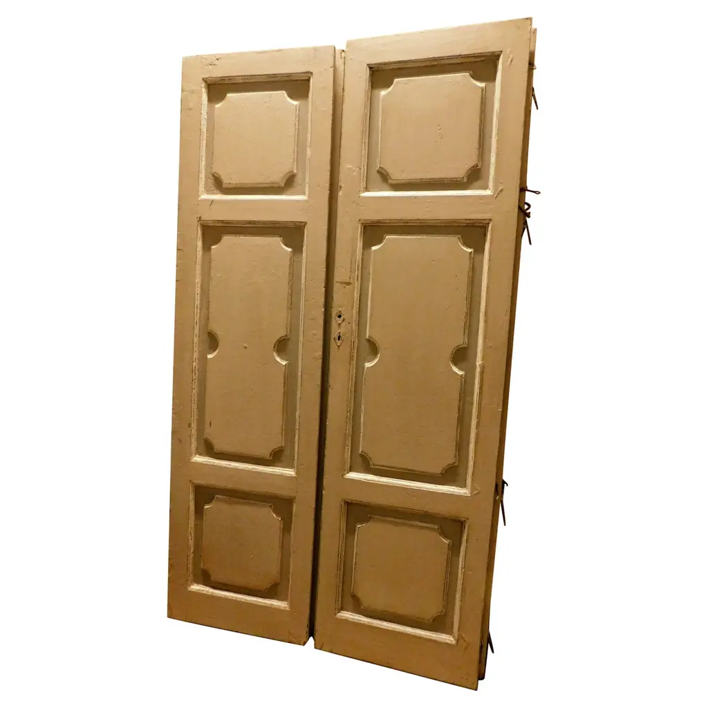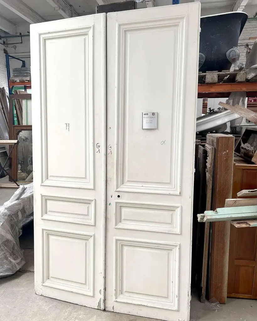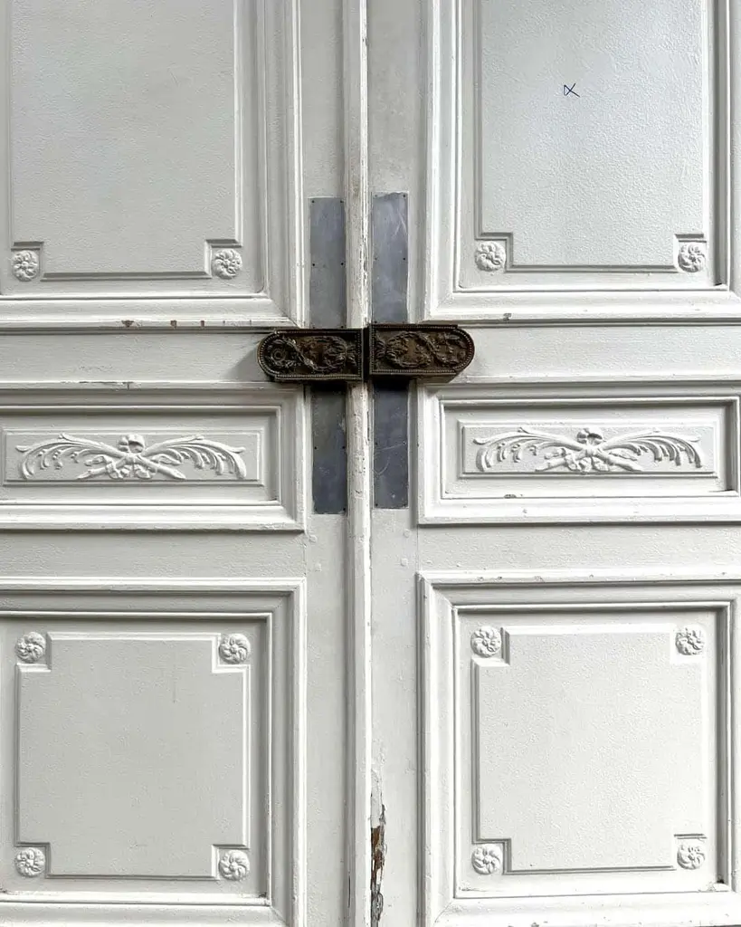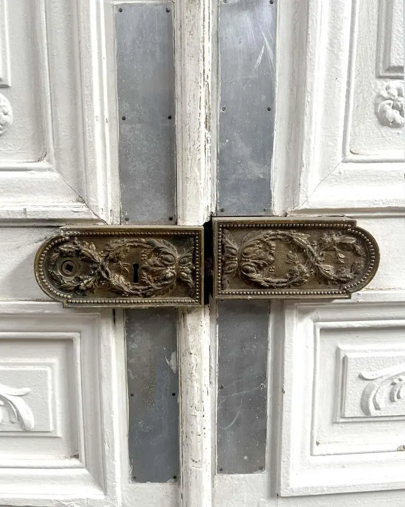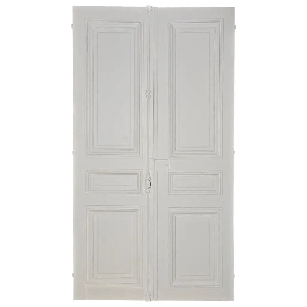 This refined Haussmann-style double door, measuring 149 × 254 cm, features beautifully molded panels, delicate floral corner rosettes, and richly detailed ironwork. Its crisp white finish complements classical interiors, offering timeless Parisian elegance and architectural character. The door includes an antique bronze lock plate with ornate Louis XVI-inspired motifs, enhancing its historic appeal.Dimensions:Total: H 254 cm × W 149 cm × D 6 cm (approx.)Materials:Solid wood (likely pine or oak)Bronze/iron hardwareOrigin: FranceCirca: 1880Ideal for luxury renovations, statement room dividers, or architectural restoration projects.