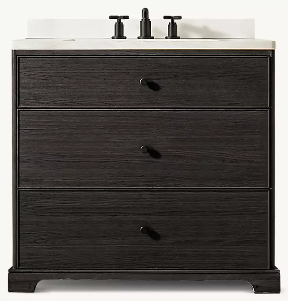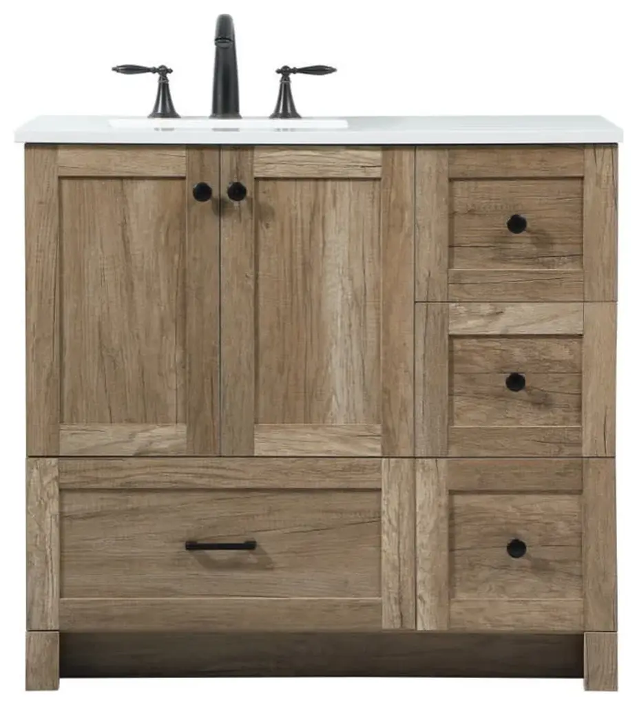 Elevate your bathroom with sophisticated vanity featuring an engineered marble top. Designed for seamless elegance, it comes equipped with an undermount porcelain sink. Organizational bliss awaits with four drawers and a cabinet, all boasting smooth soft-close glides and hinges. Completing the picture of refinement, this vanity is tastefully adorned with sleek hardware. Transform your space with this marriage of style and functionality. Included Components: Covered under Elegant Lighting's 1 year limited warranty and 1 year limited commercial warranty Engineered wood vanity cabinet with 2 doors and 4 drawers Engineered stone vanity top with a single porcelain sink Faucet is not included and must be purchased separately Achieve both style and functionality with an undermount porcelain sink, providing ample space without compromising aesthetics High-quality decorative knobs and slender bar pulls, adding a touch of sophistication Crafted from durable MDF material, this vanity promises longevity and resilience, ensuring it stands the test of time while maintaining its modern allure Experience the epitome of convenience with a freestanding vanity featuring an open back panel, making plumbing installation a breeze Revel in the beauty of a vanity that mimics the charm of real wood without the maintenance, boasting a faux wood look that adds a touch of natural warmth and rustic sophistication to your bathroom Cabinet Features: Constructed from engineered wood providing a lifetime of durability Free standing installation - vanity is seated on the floor with wall anchors, providing a functional design Double door design provides easy access to storage space 4 full extension drawers with soft-close slides allow for organized storage Soft close drawer slides operate on smooth ball-bearings and prevent drawers from slamming shut Vanity cabinet includes matching decorative hardware Vanity will ship fully assembled Vanity Top Features: Engineered stone vanity top includes a sink constructed of porcelain 3 pre-drilled faucet holes Each sink features its own rectangular single basin workspace Center drain location provides optimal draining capability Equipped with an overflow drain to help prevent spillage Cabinet Specifications: Cabinet Width: 35-1/4" (left to right) Cabinet Height: 33-1/8" (top to bottom) Cabinet Depth: 18-1/2" (front to back) Number of Doors: 2 Number of Drawers: 4 Vanity Top Specifications: Vanity Top Width: 36" (left edge to right edge) Vanity Top Depth: 19" (front edge to back edge) Number of Basins: 1 Sink Basin Dimensions: 15-13/16" L x 10-7/8" W x 8-1/4" D Number of Faucet Holes: 3 Faucet Centers: 8" (distance between the installation holes for the faucet handles)