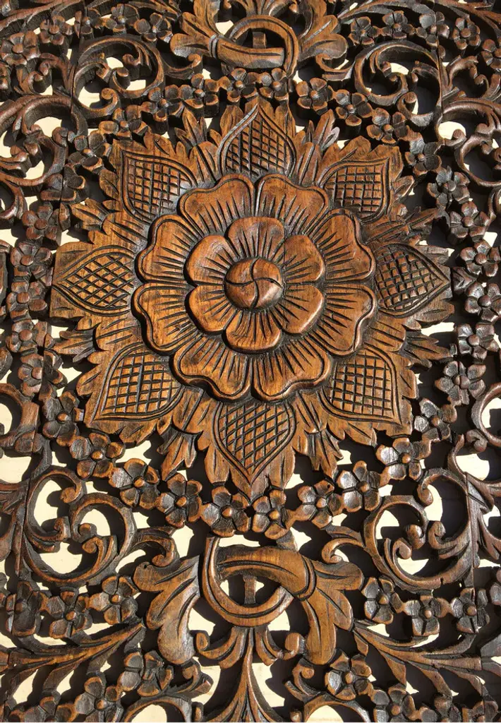 Set of 3 Large Wood Carved Panels. 3'' round carved wood wall decor. Large decorative carved wood wall art plaque. Perfect for large wall decoration. Floral wall art that will add beauty to any room. Creating luxurious decorative designs from traditional to contemporary home. Bring warmth and character to any room in your home.Made from teak wood. A product of Thailand that expresses a wonderful home decorative ambiance.Size • Weight • Color • Materials Height: 36.0" InchesWidth: 36.0" InchesThickness: 0.5" InchesWeight: 6.0 lbs.Available Color: Brown, Black Wash (Rustic)Material: Teak Wood