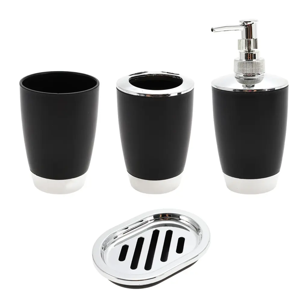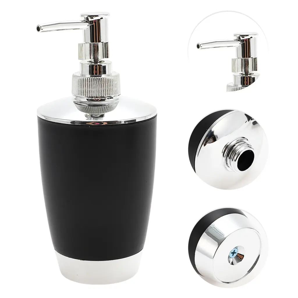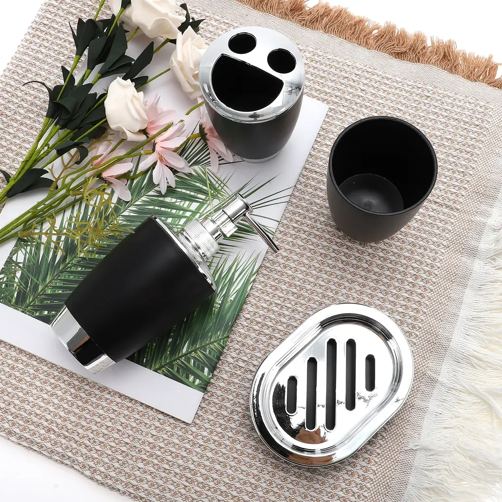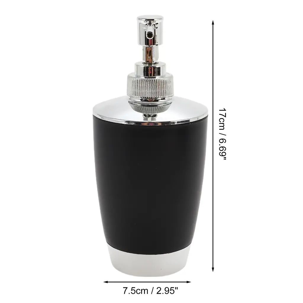 Feature:Liquid soap dispensers set are a more stylish home decor for kitchen and bathroom countertops.Stylish and modern design, simple yet elegant, adding a touch of sophistication to everyday essentials.Easy to pump, falls well on hands when pressed and does not spray on clothes.Specification:Color: BlackMaterial: PlasticBath Bottle Size: 7.5x7.5x17cm / 2.95"x2.95"x6.69"(L*W*H)Toothbrush Holder Size: 7.5x7.5x11.5cm / 2.95"x2.95"x4.53"(L*W*H)Mouthwash Cup Size: 7.5x7.5x11.5cm / 2.95"x2.95"x4.53"(L*W*H)Soap Box Size: 13x9.5x2.5cm / 5.12"x3.74"x0.98"(L*W*H)Package Included: 1 Set Soap Pump Dispenser