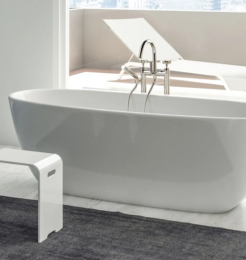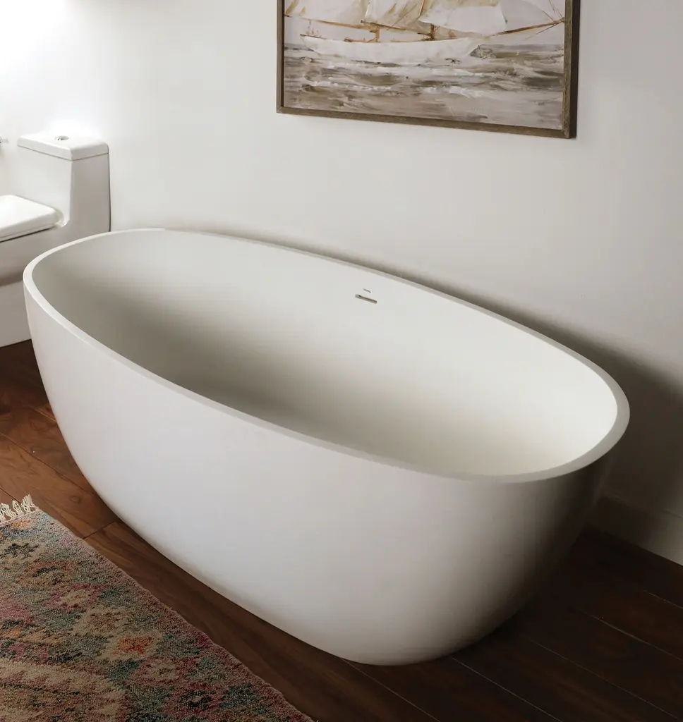 Our free-standing Eleganza soaking bathtub is crafted with solid surface, a non-porous resin material with maximum heat retention, naturally resistant to stains, mildew, and mold. Clean lines, a modern profile, and gloss or matte white finish make the Eleganza an elegant addition in any bath space.