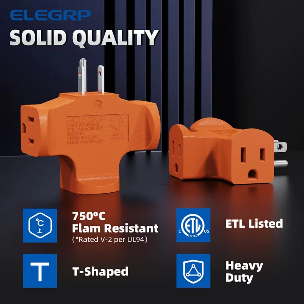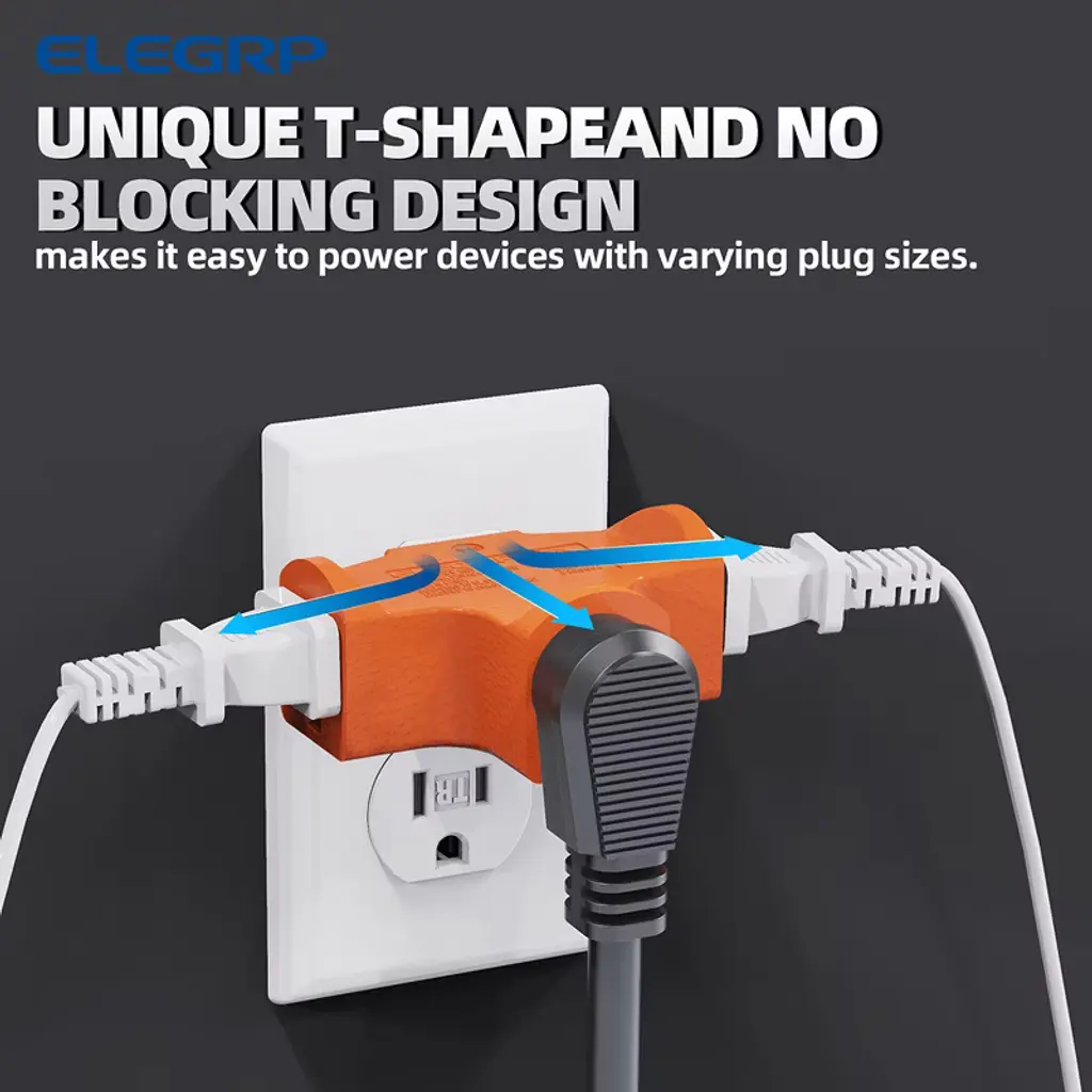 Elegrp 3 Prong Heavy Duty Power Extender To Triple Outlet In T Direction, Multi-directional Grounded 15a 125v Tap Adapter Plug Etl Listed, Orange 3Pc