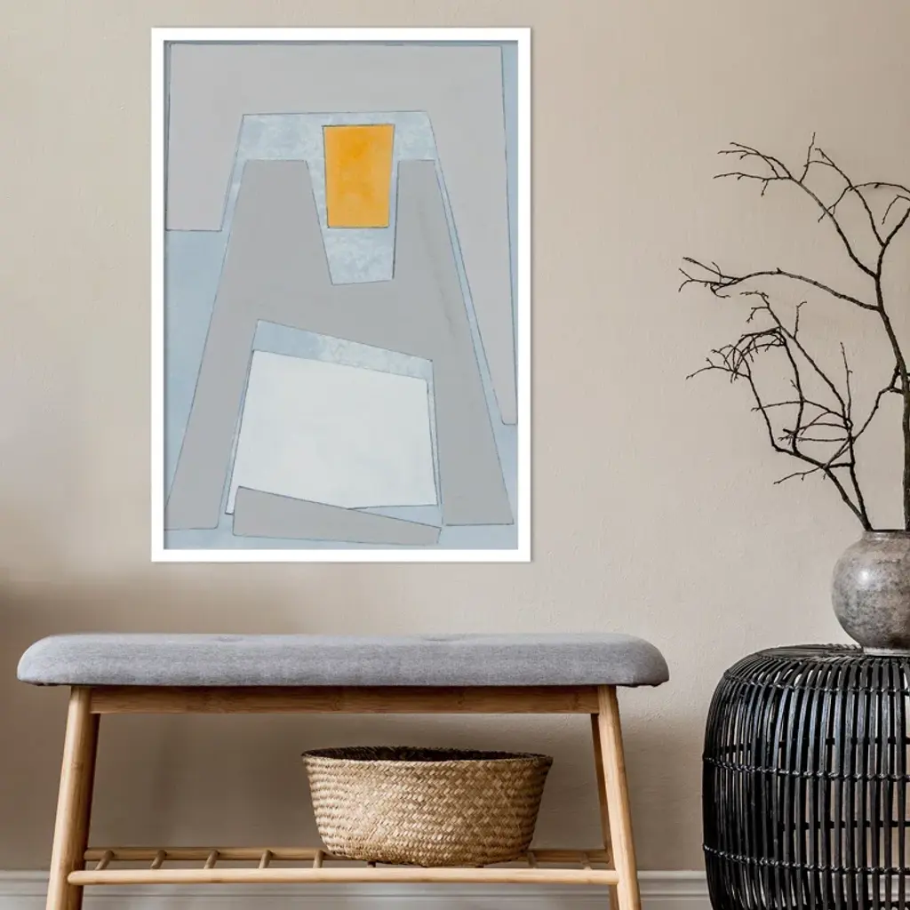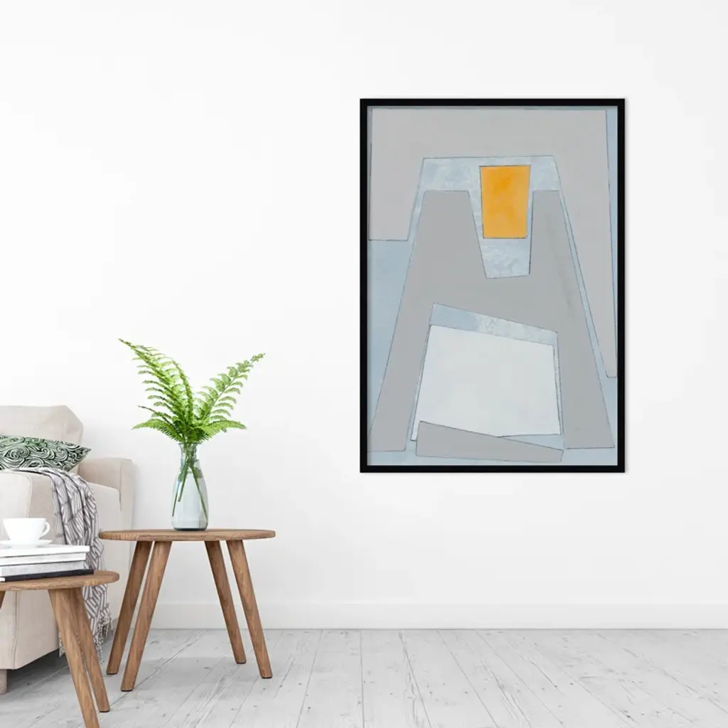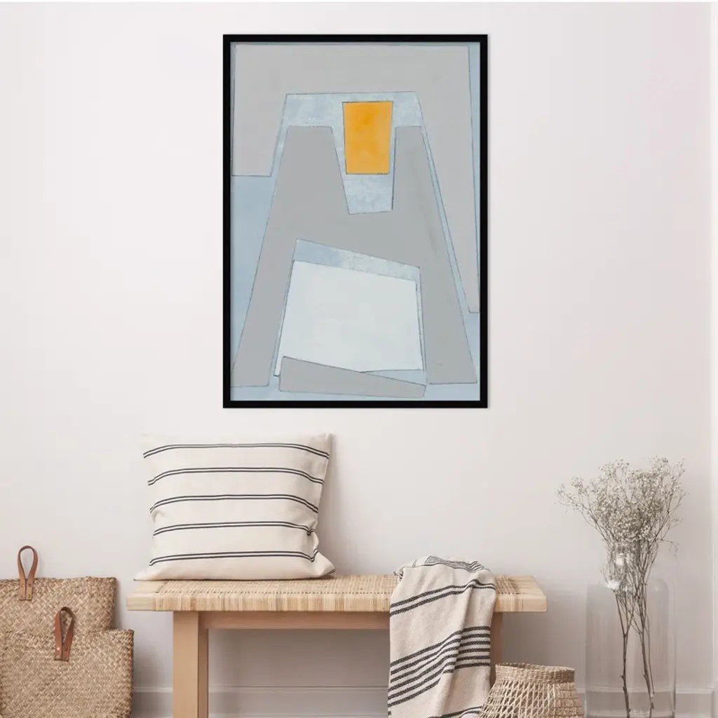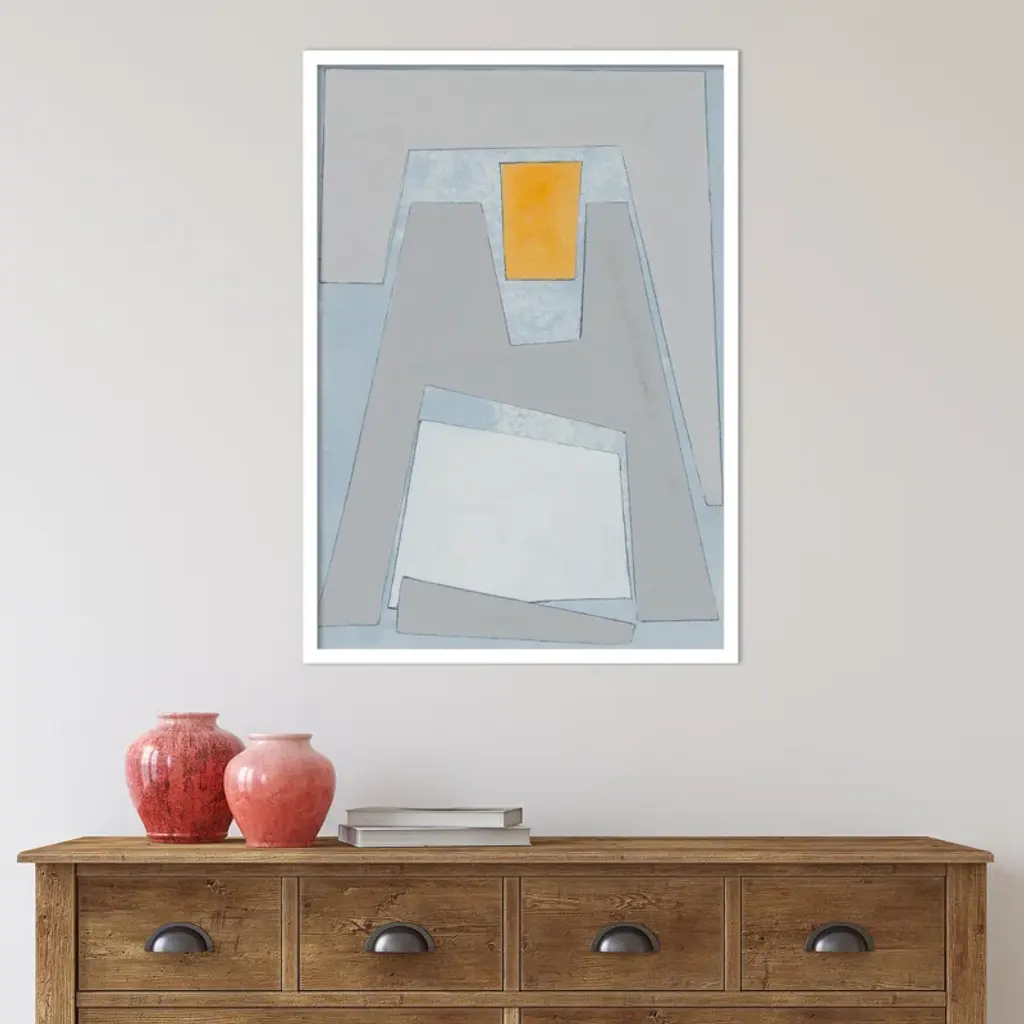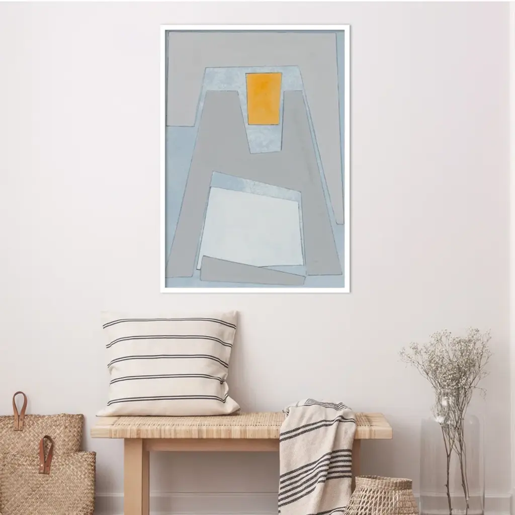 Defined by architectural elements abstracted into pure color + form, this print by artist Rob Delamater conjures an obscure + symbolically weighted sense of place – like a blueprint of a half-remembered dream. It’s giclee printed using fade-resistant inks + arrives ready to hang in a wooden frame.